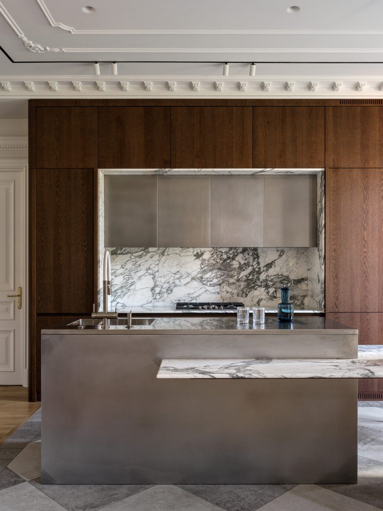 Определённые сложности возникли с кухонной зоной. Реализовать полноценно весь функционал, не сбив тональность интерьера, оказалось задачей непростой. Замаскировать газовый котёл и бризер не только грамотно, но и эстетично помогала целая команда из трёх подрядчиков. Но авторам проекта удалось состыковать мебельщиков, каменщиков и металлистов так, чтобы все мастера отработали слаженно и добились желаемого результата.