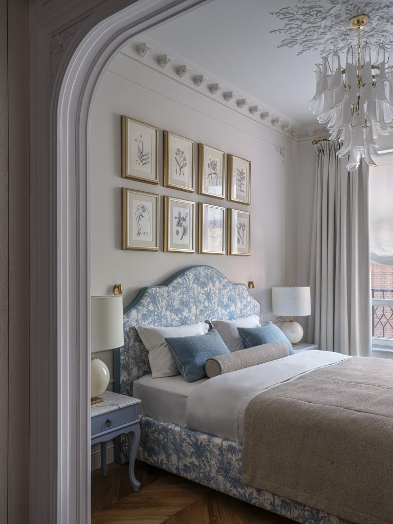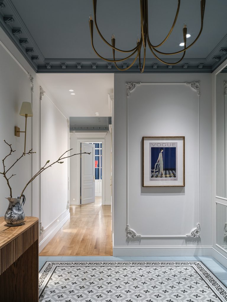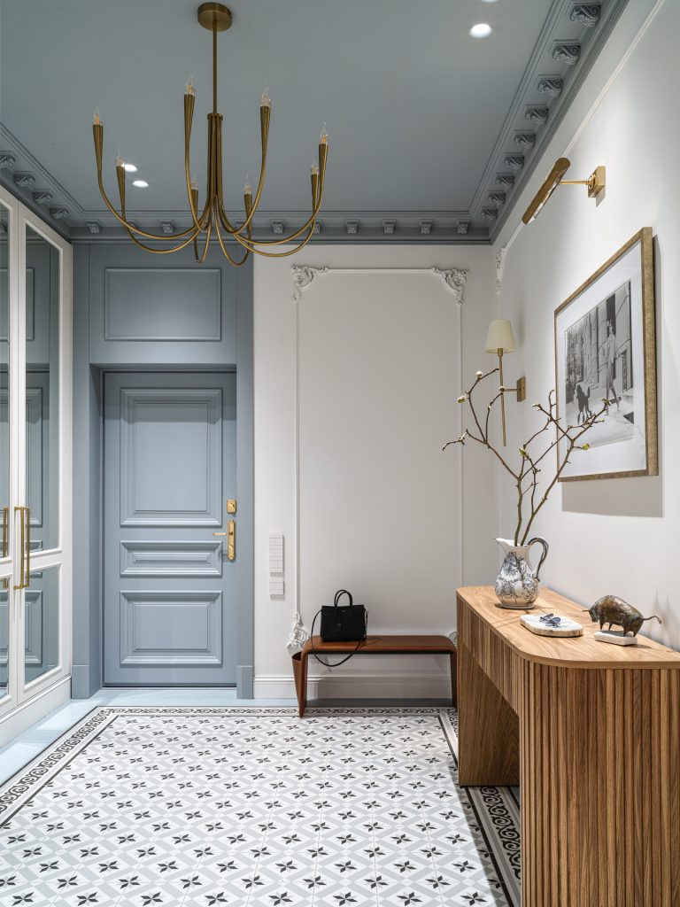 Колористика проекта получилась очень лиричной — бежевые, белые, молочные, мятные, голубые и пудровые оттенки, звуча с разной громкостью, создают нужное настроение и обеспечивают богатый тембр. Особенно нежной получилась спальня, где воздушную гамму поддержали хрупкие растительные мотивы. Обивка кровати, светильник с элементами-лепестками, изображения орхидей на стенах, флористический орнамент потолочной розетки — все эти очаровательные детали наполняют помещение визуальной гармонией, расслабляют, привносят милые винтажные ноты.