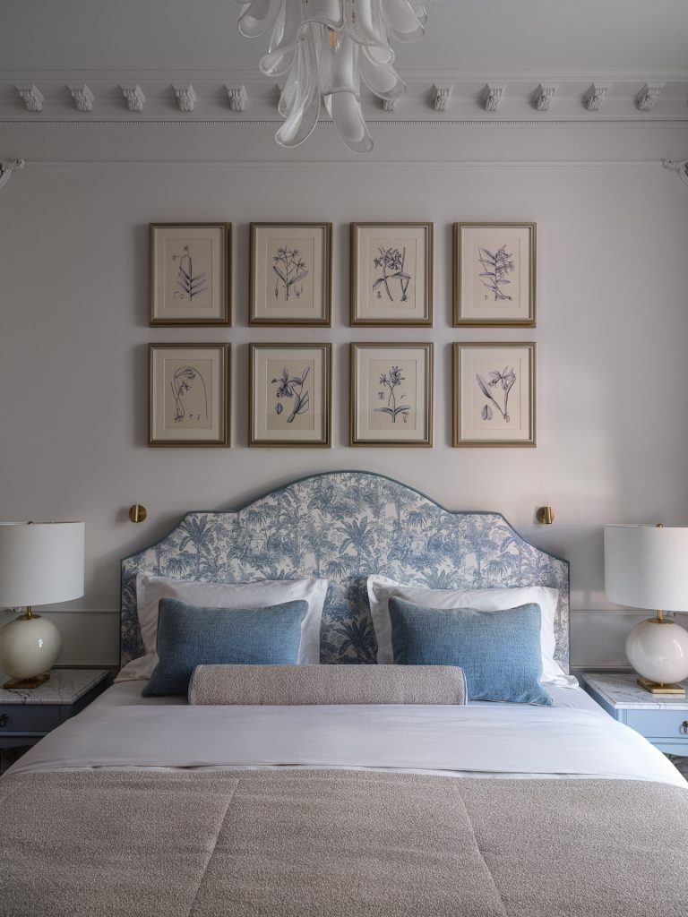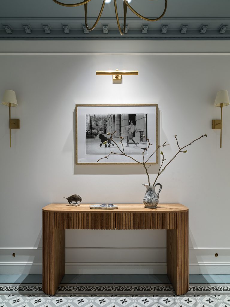 К слову, уже на стадии проектирования дизайнеры понимали, что искусство станет неотъемлемой частью интерьера. Поэтому необычную идею заказчика — разместить в кабинете бабочек в рамах — авторы проекта сразу же поддержали, с любовью выбирая самые красивые экземпляры, ориентируясь в том числе и на гамму: синие и голубые оттенки. Уже на финише проекта владелец добавил в интерьер копии работ известных фотографов, что добавило пространству уникальности.