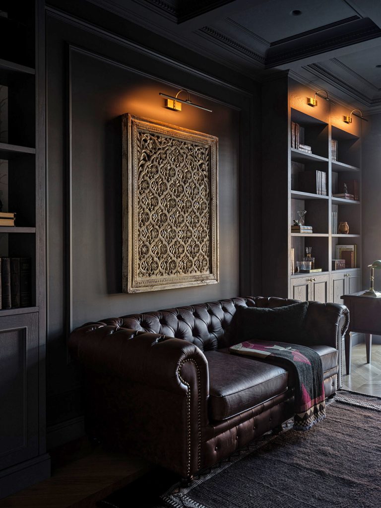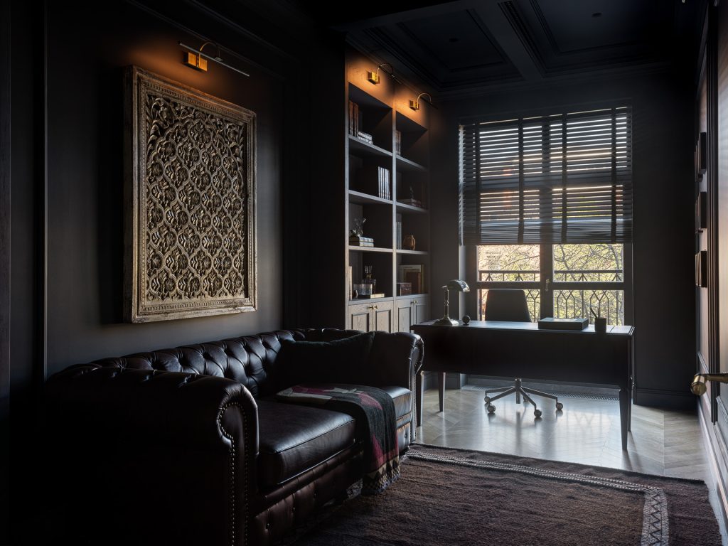 Есть в проекте и необычное развитие концепции: свой кабинет владелец хотел видеть решённым в тёмных тонах, в стилистике английских клубов, подчёркнуто мужской и безупречно элегантной. В комнате выделили рабочую зону и место для отдыха. Французские ноты — классический паркет ёлочкой и лепнину — сохранили, чтобы поддержать единство интерьера, но добавили выразительные и запоминающиеся детали в колониальном духе. В помещении появились кессонные потолки, респектабельная мебель (диван, стол и стеллажи выполнили по эскизам студии), а стену украсило впечатляющее деревянное панно с затейливой резьбой из мангового дерева из коллекции заказчиков.