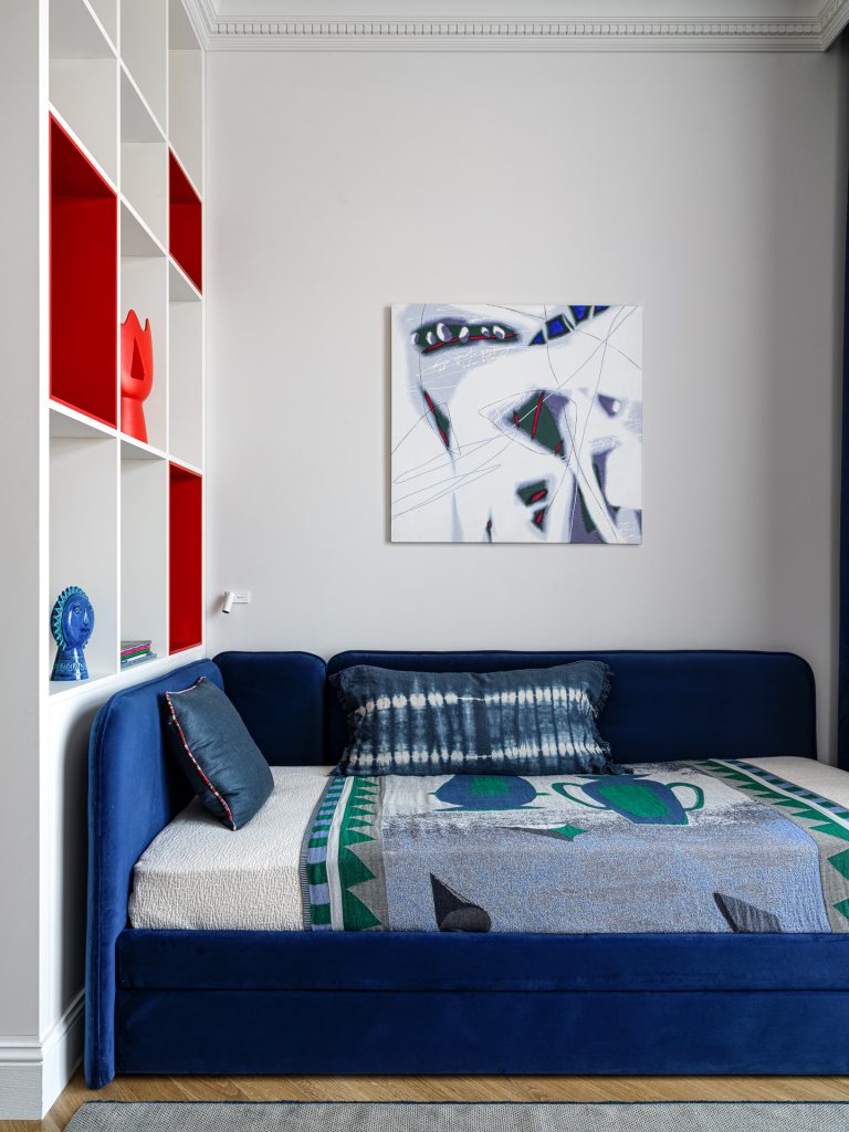 Синяя палитра, ставшая заглавной в проекте, в комнате сына приобретает особую энергичность. Комната не такая большая, а функциональных зон в ней требовалось разместить немало: это и спальное место, и уголок для отдыха, и вместительная гардеробная, и рабочая зона, и продуманная система хранения, где в том числе предстояло расположиться коллекции «Лего». Поэтому в данном случае цветовая гамма стала одним из инструментов, позволяющих выполнить эргономичное и комфортное зонирование. Чистый белый, глубокий синий, сочный красный помогают визуально структурировать интерьер, заряжают позитивом, добавляют динамики.
