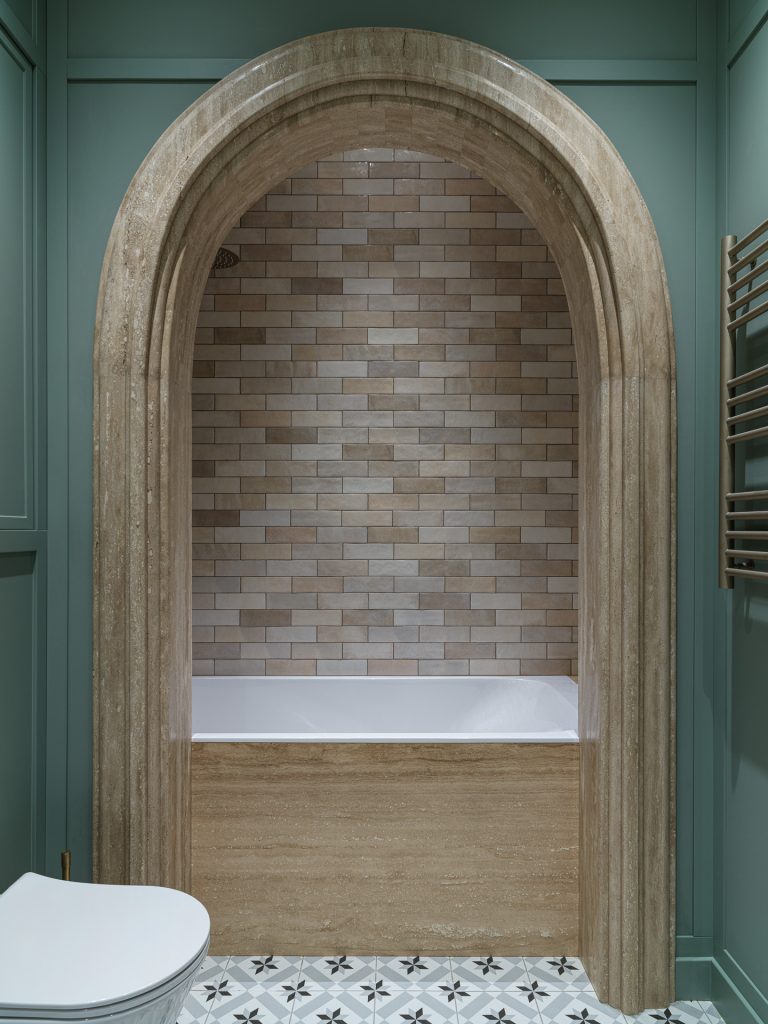 Ещё одно оригинальное решение команда TWINS использовала в санузлах, оформив арочными проёмами душевую и ванну. Это создаёт особую камерность, поддержать которую дизайнерам помогли припылённые тона и винтажные детали, такие как мелкая плитка и обои с цветочным принтом.