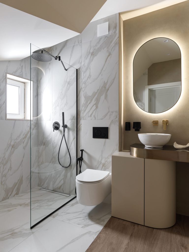 Уютный минимализм определил и характер интерьера санузлов. Для отделки мастер-ванной и гостевого санузла Марина Безух применила итальянскую плитку ETOILE CREME от Florim и плитку под травертин SELECT TRAVERTINO от FMG, красоту фактуры которой не скрывает прозрачная душевая перегородка. Сантехника и аксессуары от проверенных производителей не только безукоризненно выполняют свои функциональные задачи, но и выстраивают стильное актуальное пространство. При этом оно продолжает мотивы, звучащие в интерьере в целом: дизайнер сделала ставку на естественные оттенки, выразительную подсветку, природные фактуры, закруглённые линии, создав лаконичный и уютный интерьер.