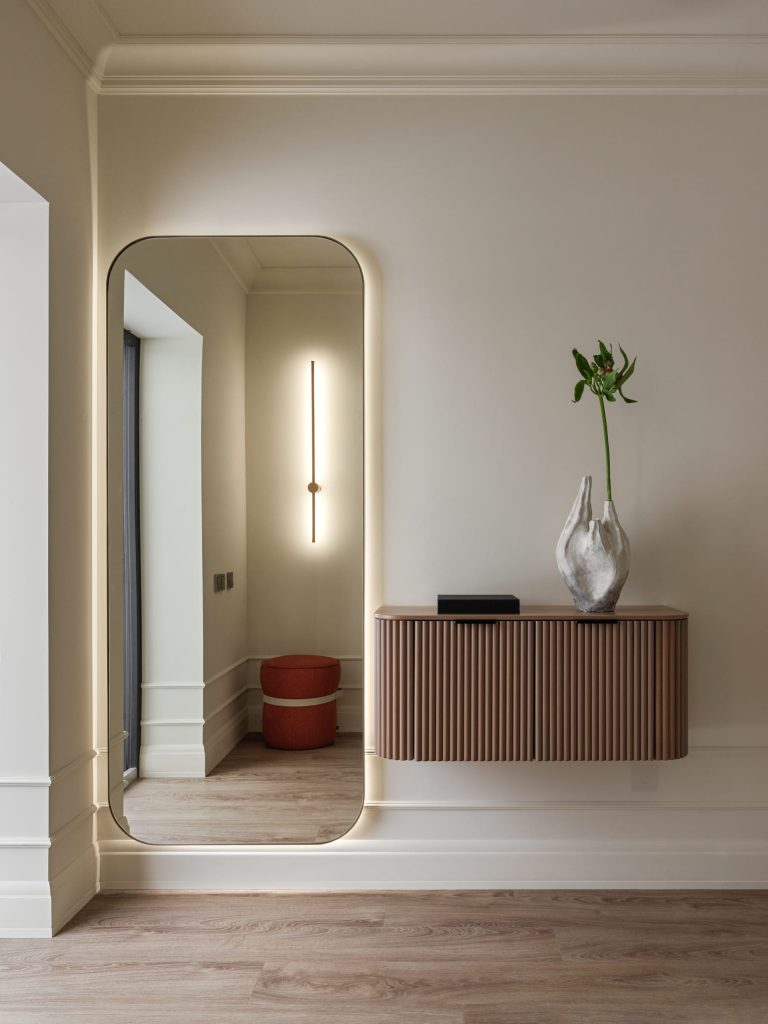 Но при этом пространство отлично структурировано за счёт использования разнообразных фактур и графичных элементов. Одной из самых эффектных деталей стала стеклянная перегородка в гостиной — тонкие чёрные росчерки словно образуют стильную раму, делая картину цельной и законченной. Арочные линии множатся, возникая и в молдингах, и в формах мебели, и в зеркалах,