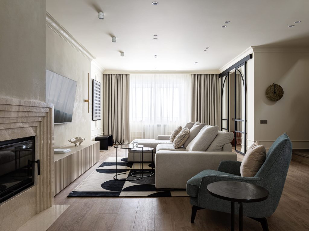 Общественную зону — от стен до текстильного оформления — Марина Безух наполнила схожими оттенками, удивительно тёплыми и нежными.