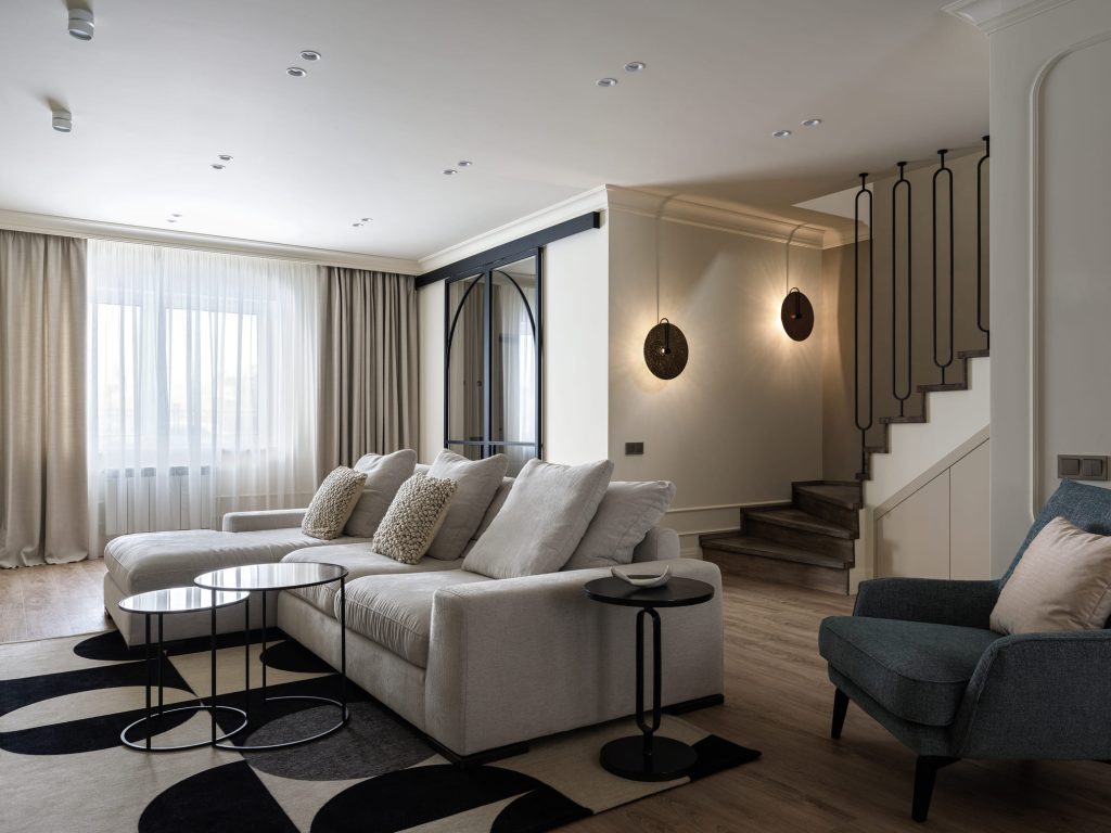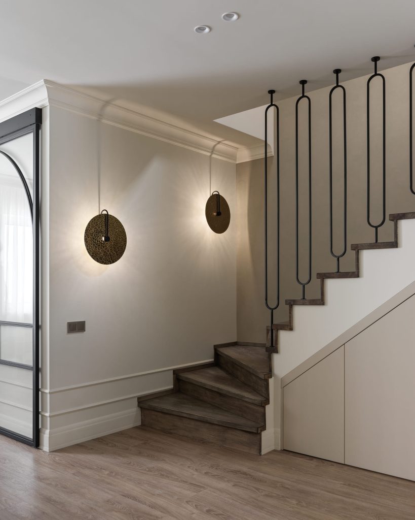 В стилистических интонациях прослеживается влияние минимализма и неоклассики: пространство звучит мягко, спокойно и обволакивающе. Практически всю площадь первого этажа заняла общественная зона. Каждая деталь здесь подобрана с филигранной точностью: эффектная фактура декоративной штукатурки, благородный оттенок кварцвиниловой плитки Moduleo, связывающей все помещения, светильники простых, но интересных линий, вместительный диван Olta Avant… Шарма и теплоты добавляют всплески матового золота и латуни — владелица хотела видеть в пространстве золотые элементы, но чтобы избежать декоративной крикливости, дизайнер предложила более элегантные решения.