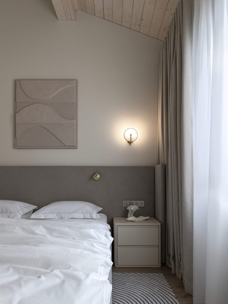 При этом зону сна ничуть не урезали в правах — здесь достаточно места, чтобы полноценно отдохнуть. Сливочные тона, плавные линии, постельное бельё LAFLY HOME BRAND, ковёр Carpet Decor с органическими линиями создают лиричный и мягкий ансамбль.