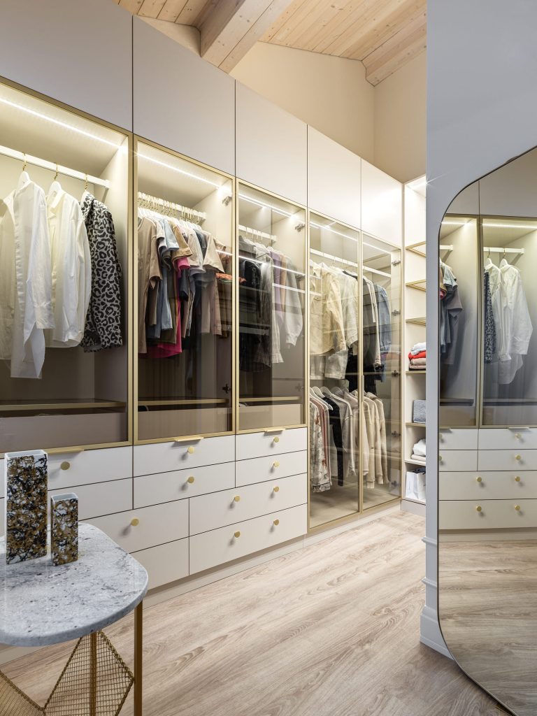 На пользу пространству обернули и ещё одну особенность — удлинённую спальню, отведя часть комнаты под гардеробную. В местной столярной мастерской изготовили конструкцию, где предусмотрены и места хранения одежды, и ящики для аксессуаров, и зеркало во весь рост. Площадь гардеробной позволяет при желании организовать в ней и рабочее место.