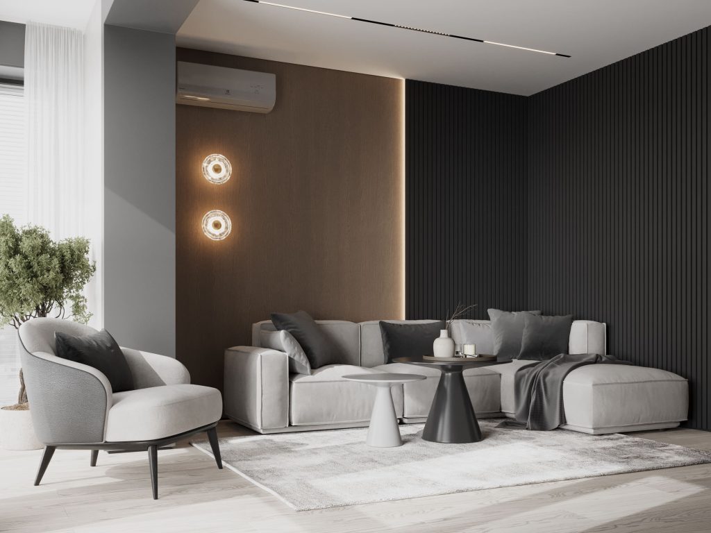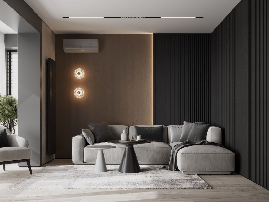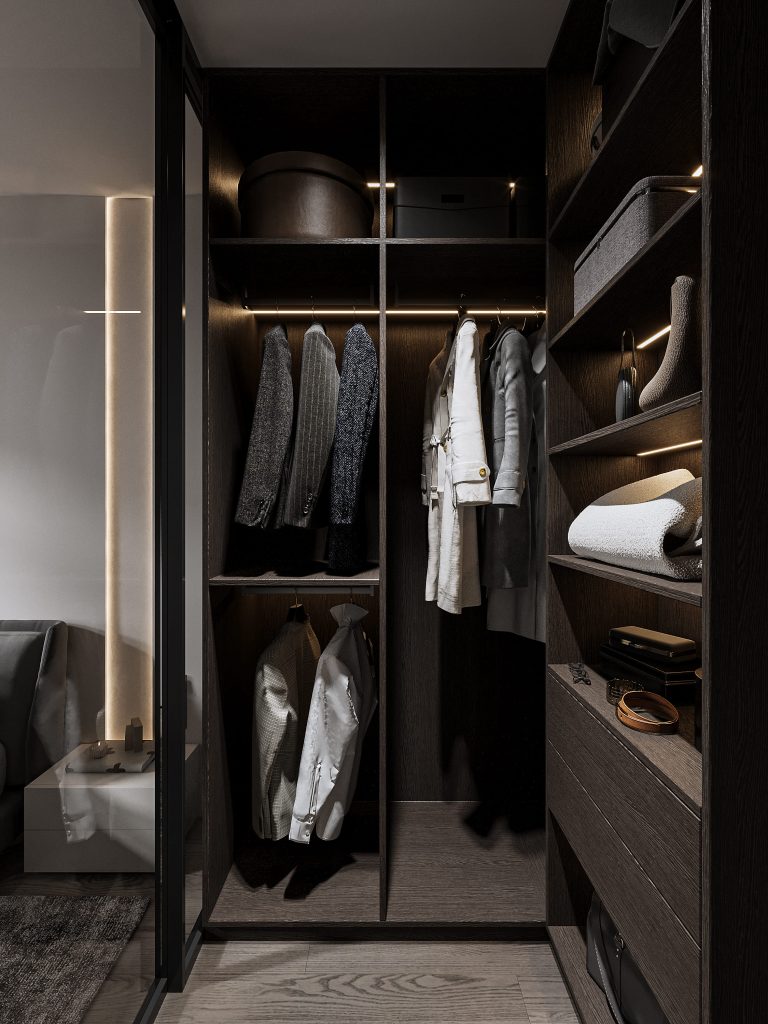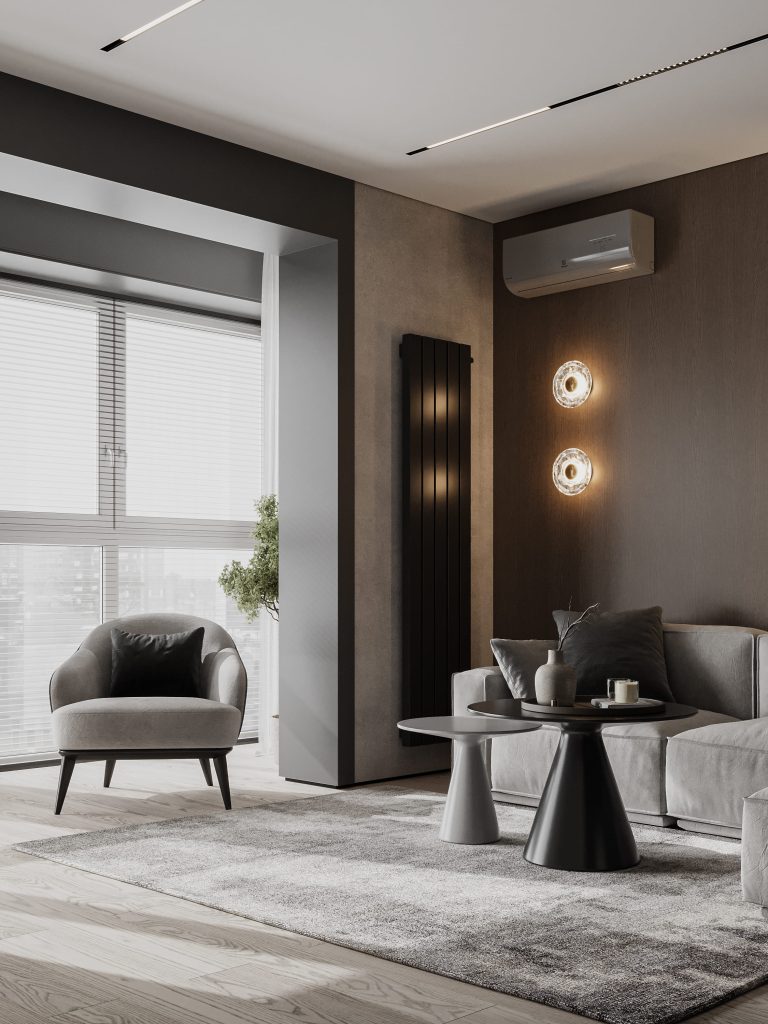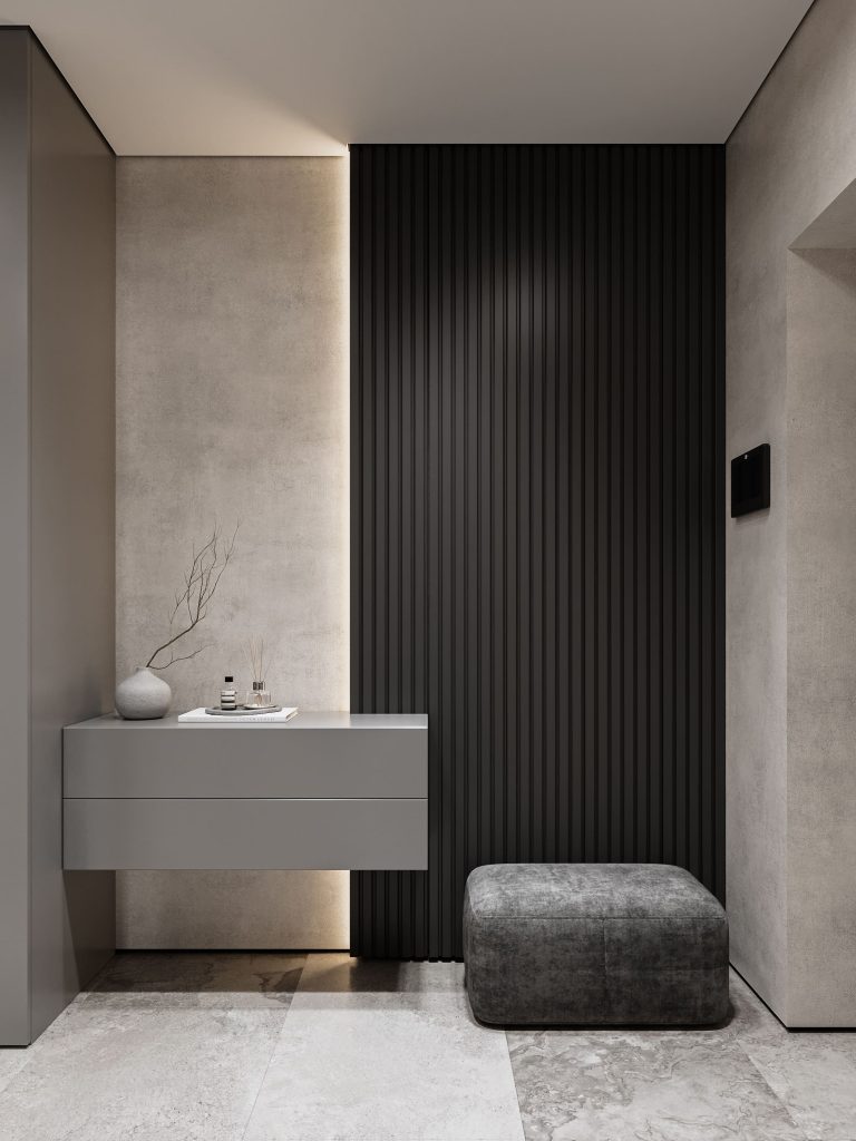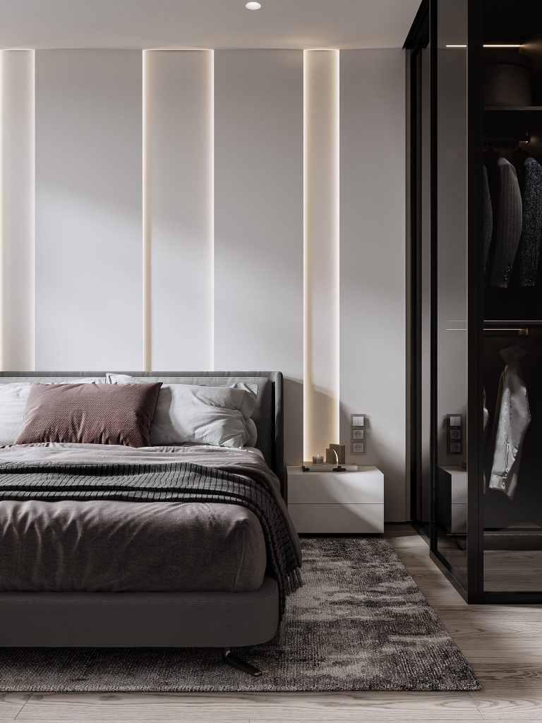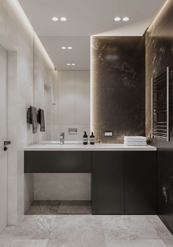 Колористика проекта — сдержанные и естественные оттенки — наверняка придётся по душе многим, ведь все мы страдаем от избытка визуального шума. При этом, чтобы светлый монохромный интерьер не «расплывался», дизайнер мастерски структурировала пространство, добавив акцентные панели с подсветкой, вертикальные радиаторы, плотную фактуру дерева, достаточно объёмные предметы мебели и акценты тёмного цвета.