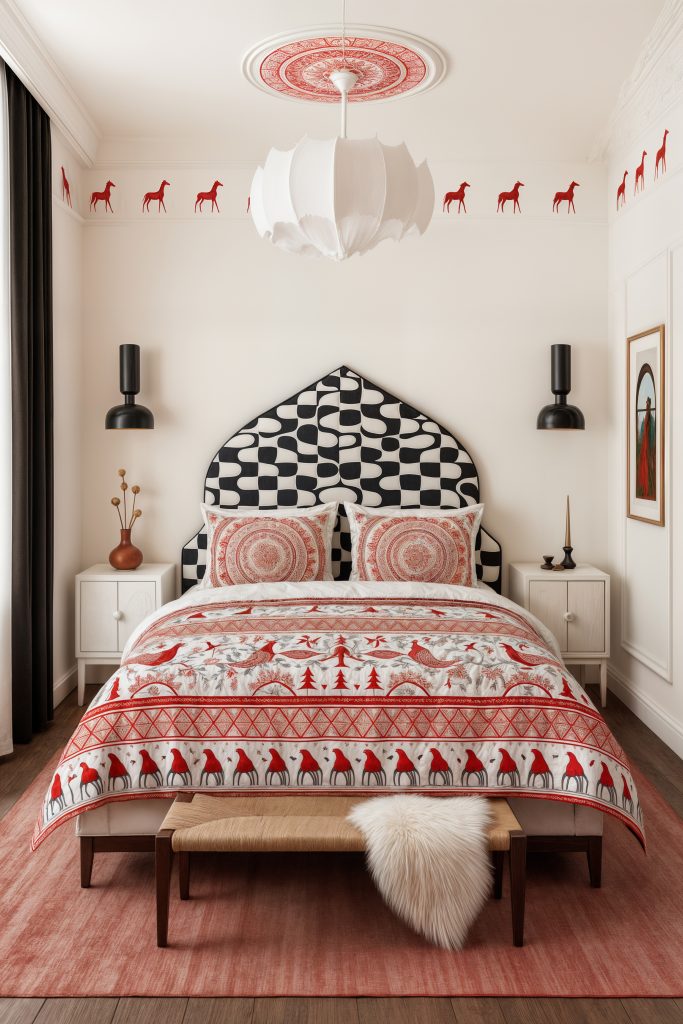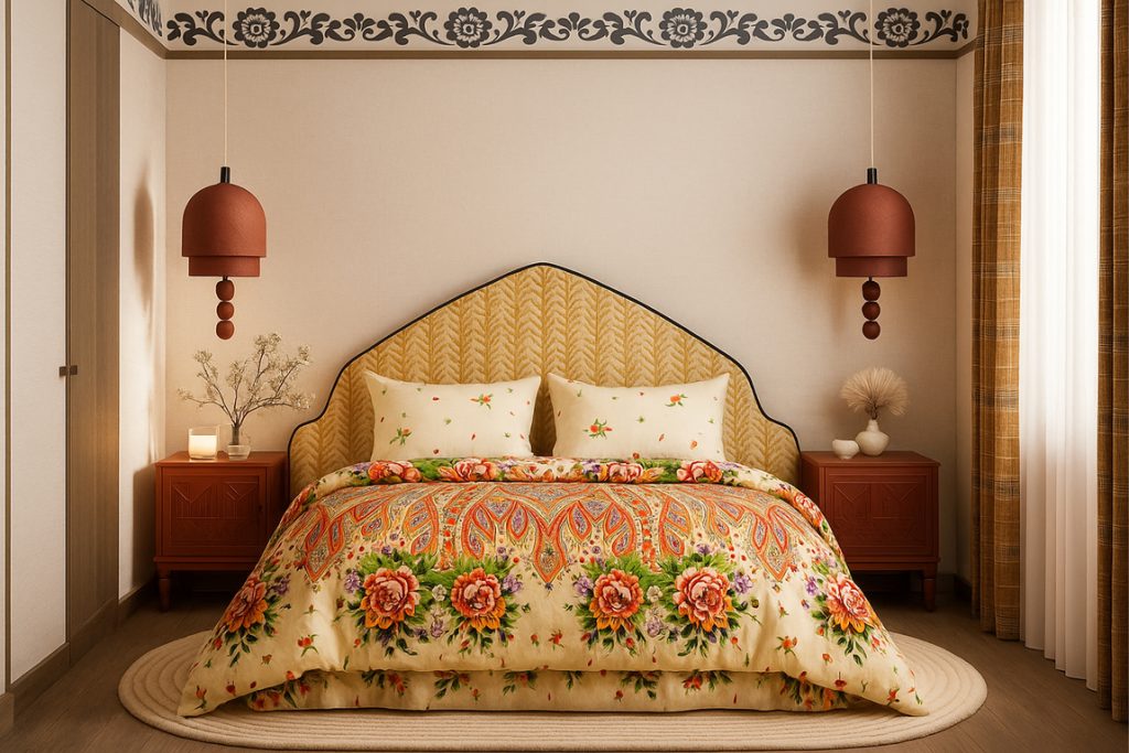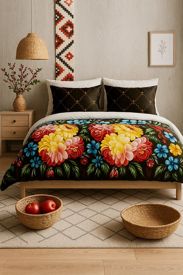 Узоры, знакомые по народному искусству, сегодня всё чаще становятся акцентами в мебели, подушках, шторах и кухонных аксессуарах, формируя особую атмосферу дома.
