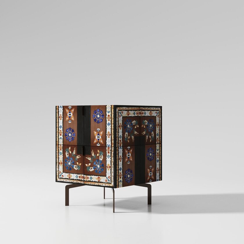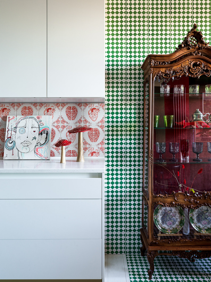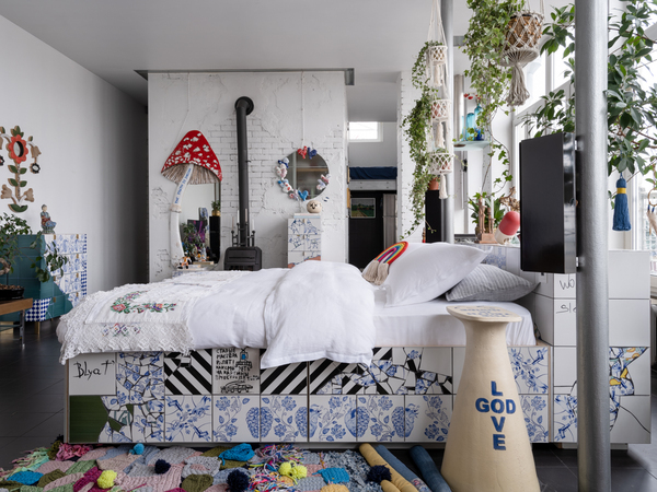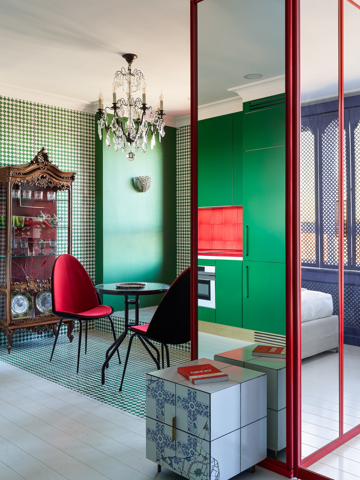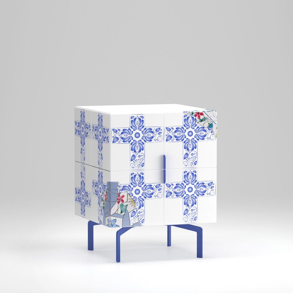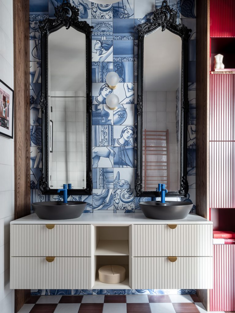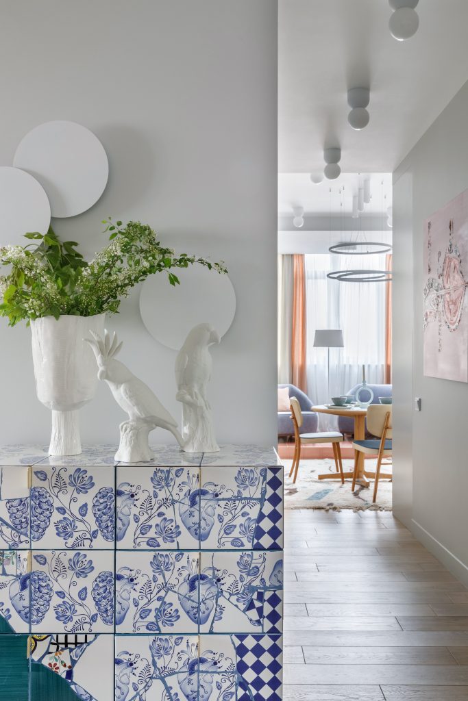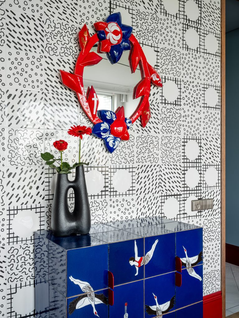 Все для того, чтобы показать, как органично, нетипично и стильно он может быть адаптирован в интерьере – от принтов на стенах до самой мебели в комнатах. В итоге в пространстве, например, гармонично расположились: обои и кресла из коллекции «Синий русский», комод из «Снов» и картонное зеркало-цветок с мотивами русского узорочья 17 века.
