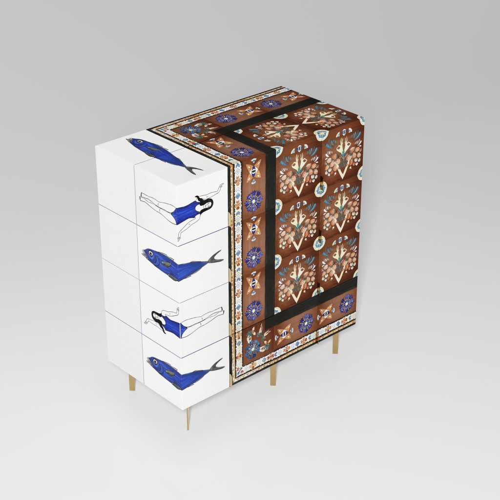 Кто знаком с моим творчеством, сразу узнает и образ рыбок-русалок, и паттерн с котиком — они уже появлялись на плитке по моему дизайну, коллекция Синий Русский.