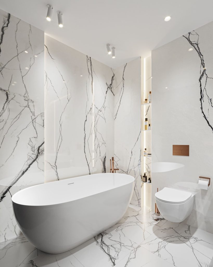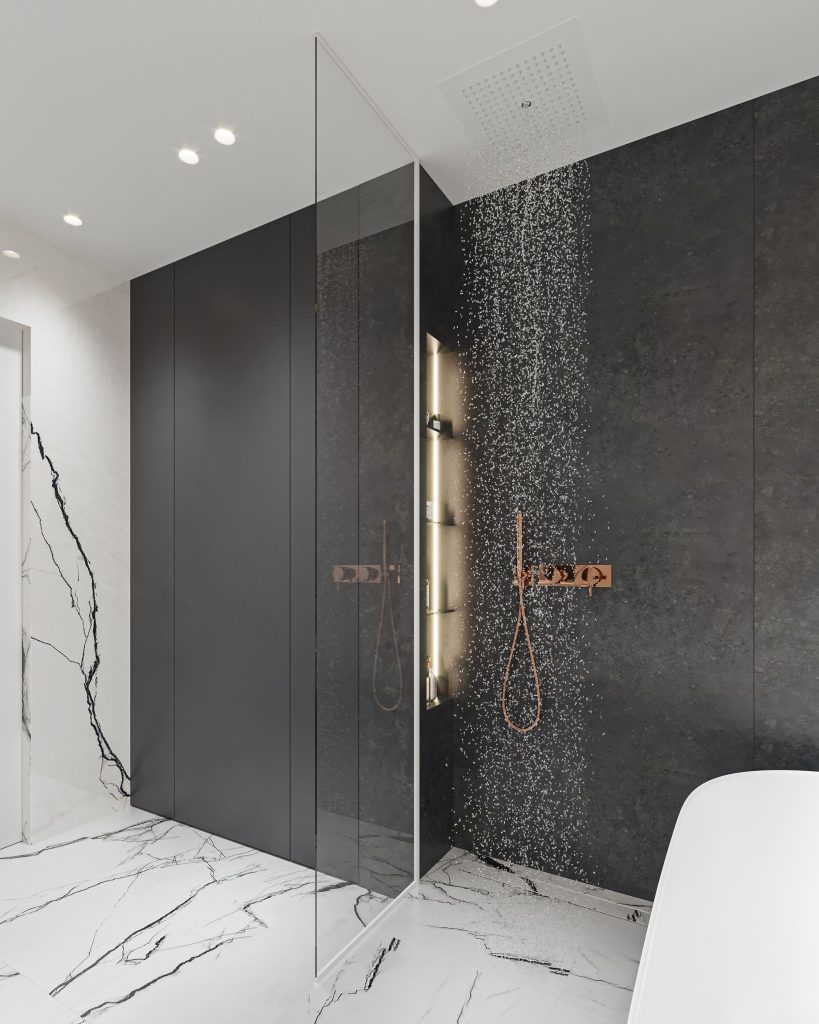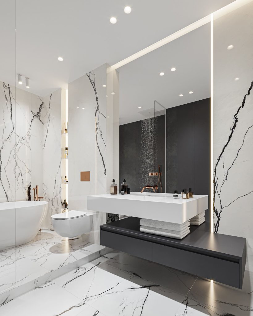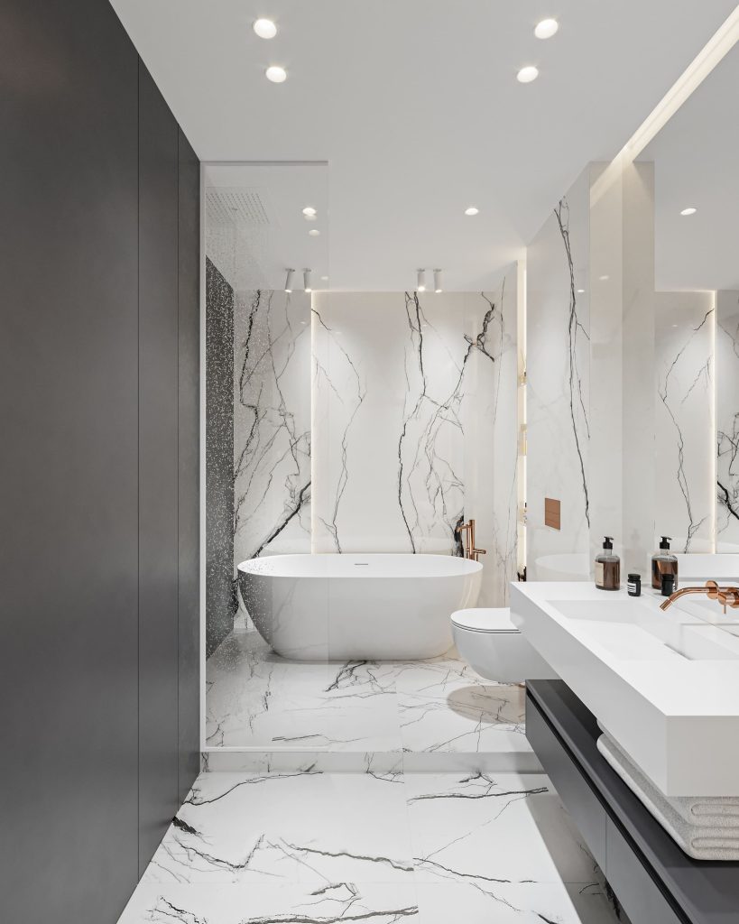 Для просторной ванной комнаты выбрали впечатляющее контрастное решение. Общим знаменателем для тёмных и светлых оттенков стал керамогранит с имитацией итальянского мрамора. Отдельно стоящая ванна, лаконичная сантехника, продуманные системы хранения, большое зеркало, наполняющее помещение сиянием, — пространство напоминает об атмосфере роскошного отеля, даря владелице настоящее наслаждение.
