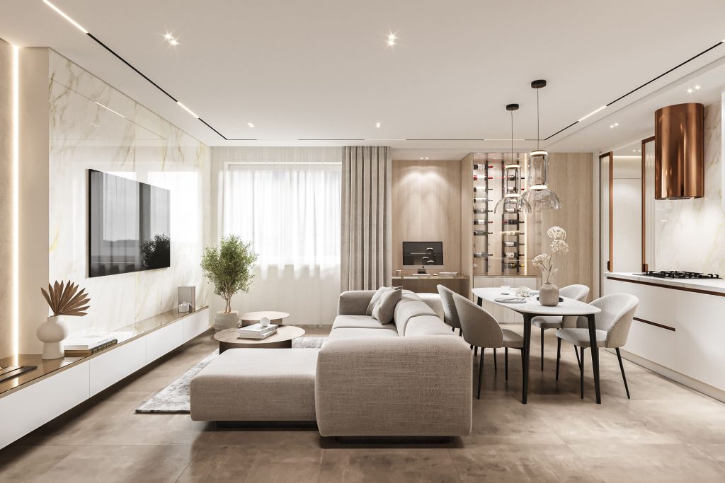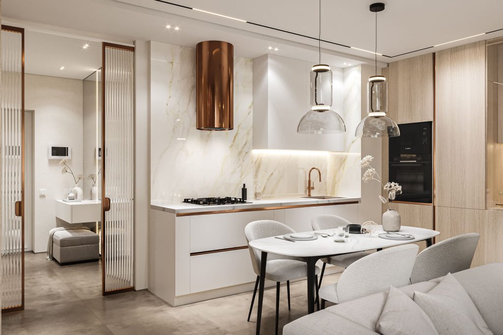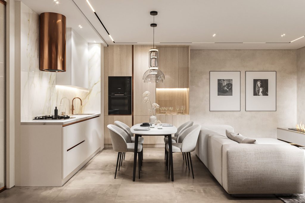 Стилистическая концепция тяготеет к современному направлению — это пространство, где всё «необходимо и достаточно». Оно лаконичное и чистое, сдержанное и элегантное, но при этом не лишённое интересных находок, выразительных акцентов, с любовью подобранного декора.