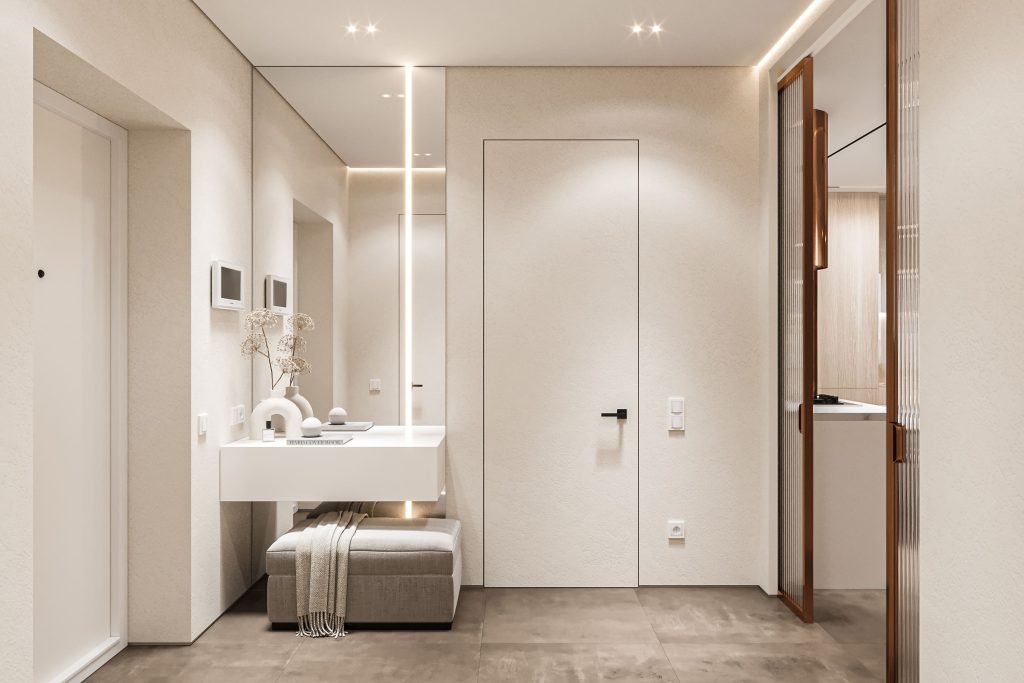 Мария Бойчук скрупулёзно продумала и оформление входной зоны. Мы проводим здесь буквально минуты, но они способны определить наше настроение на целый день. В холле появился уголок с зеркалом под потолок и мягким пуфом: здесь владелица может перед выходом убедиться, что выглядит идеально и готова покорять мир! А возвратившись домой после напряжённого рабочего дня, она сразу попадает в сияющее, светлое, безмятежное пространство, обещающее комфорт