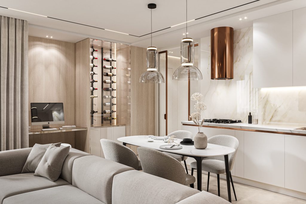 Установив удобную систему хранения, предусматривающую также винный шкаф, Мария Бойчук получила нишу, где идеально разместился рабочий уголок.