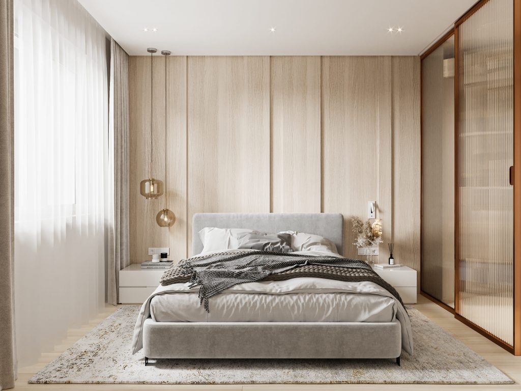 Чтобы пастельное цветовое решение не приводило к монотонности, Мария Бойчук мастерски разнообразила оформление спальни. Для отделки пола было выбрано функциональное и стильное покрытие, а акцентную стену оформили панелями разной ширины и с разной глубиной. Они привносят объём и многослойность, а вертикальные линии, усиленные светильниками-подвесами, расположенными только с одной стороны кровати, создают иллюзию более высокого потолка, добавляют воздуха и лёгкости.