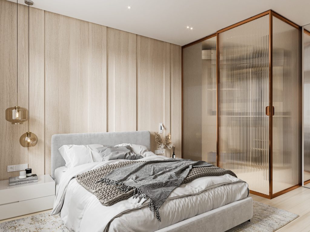 Часть комнаты отвели под гардеробную систему, продублировав решение, использованное в прихожей: раздвижные перегородки с рифлёным стеклом и акцентной тонкой окантовкой. Гардеробная получилась компактной, но очень удобной – спроектированная система хранения позволяет разместить одежду, обувь, аксессуары.