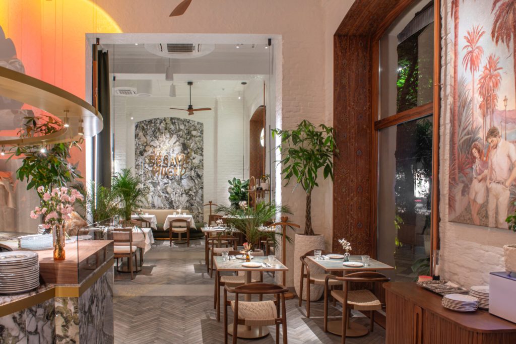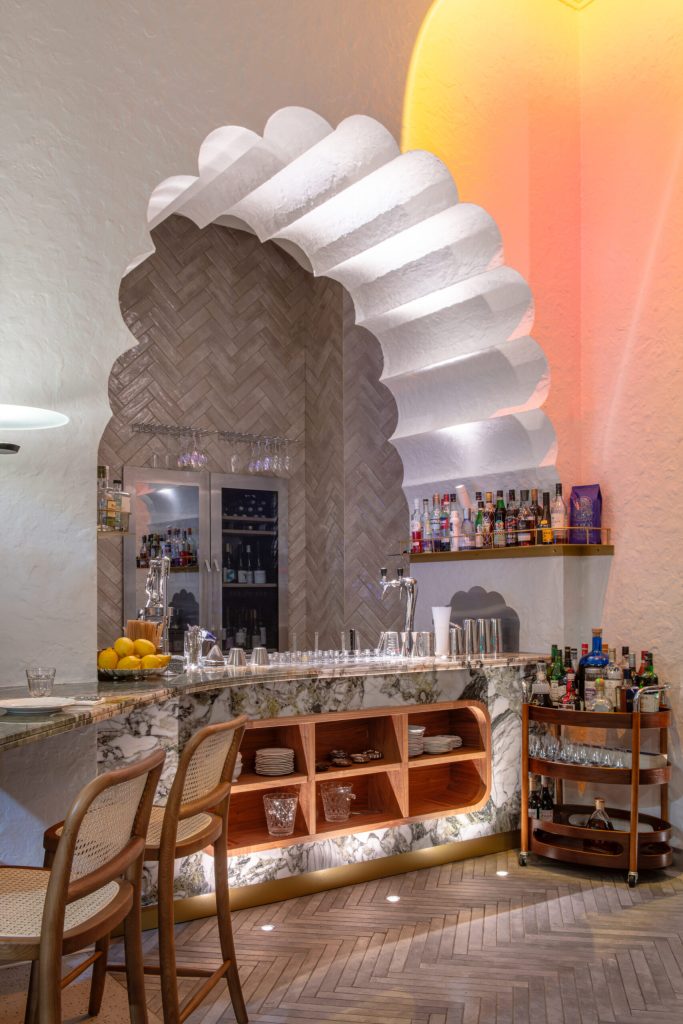 Арки, множество растений, сложная фактура стен, натуральные материалы и текстиль формируют образ изысканного богемного интерьера. Однако расстановка и дизайн мебели — осознанный выбор, как комплимент стилю современных французских бистро.