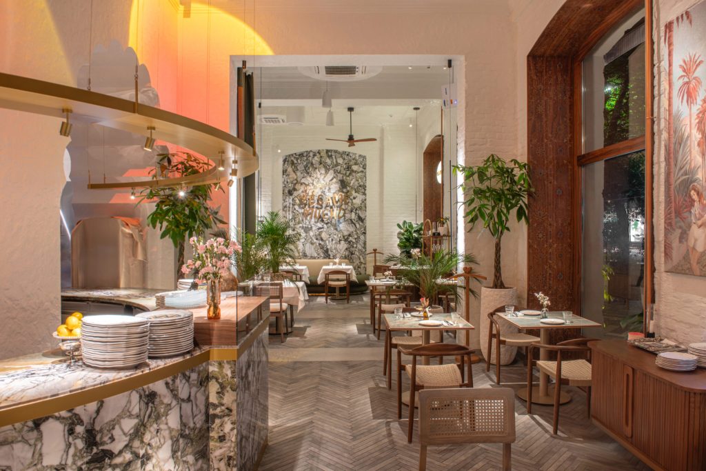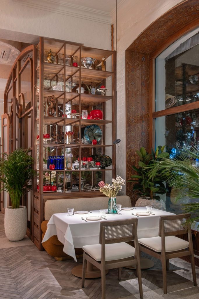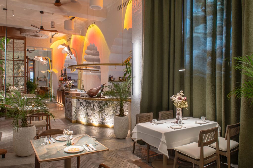 «Романтический стиль с элементами историзма ощущается в интерьере. Мы сохранили историческую кладку, воссоздали лепнину, усилили образ с помощью арок, орнамента, потертых узоров на оконных откосах — мавританские мотивы характерны для Испании. В ресторане словно всегда золотой час: сливочные оттенки и блики заходящего солнца создают это впечатление. Гиперболизированные цветы придают атмосфере романтические ноты, словно гости пребывают в иллюзорном мире, стране грез», — отмечает Екатерина Пергаева, руководитель креативного отдела Pergaev Bureau.