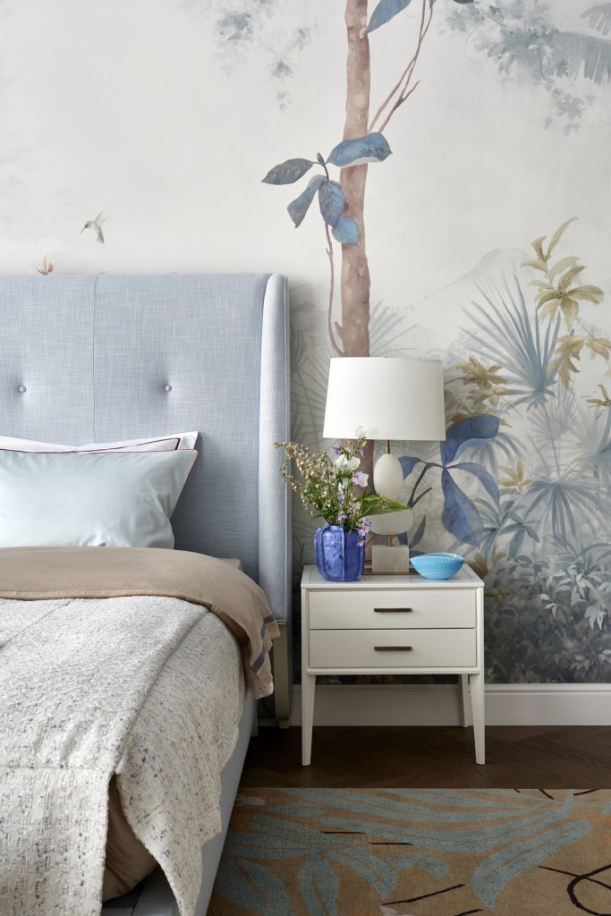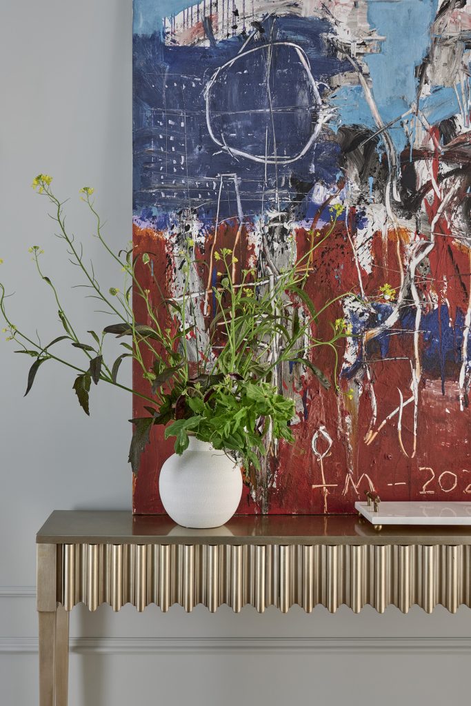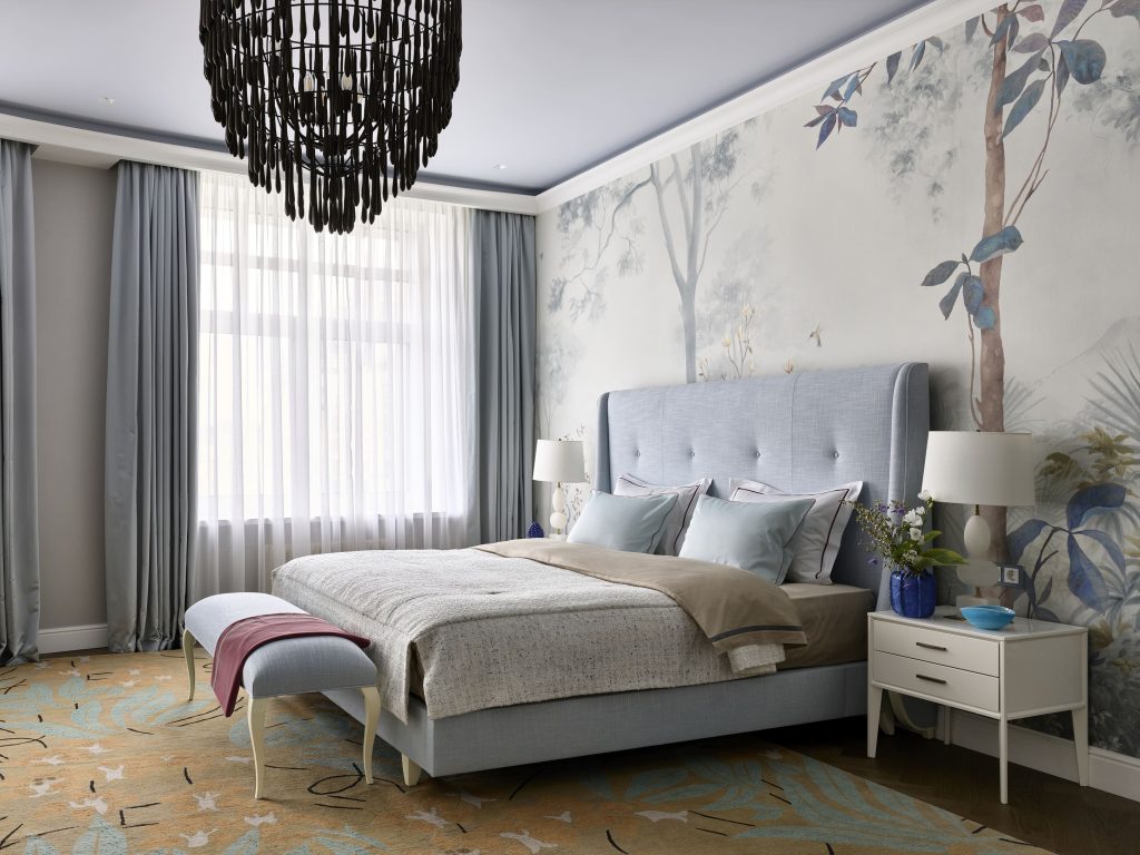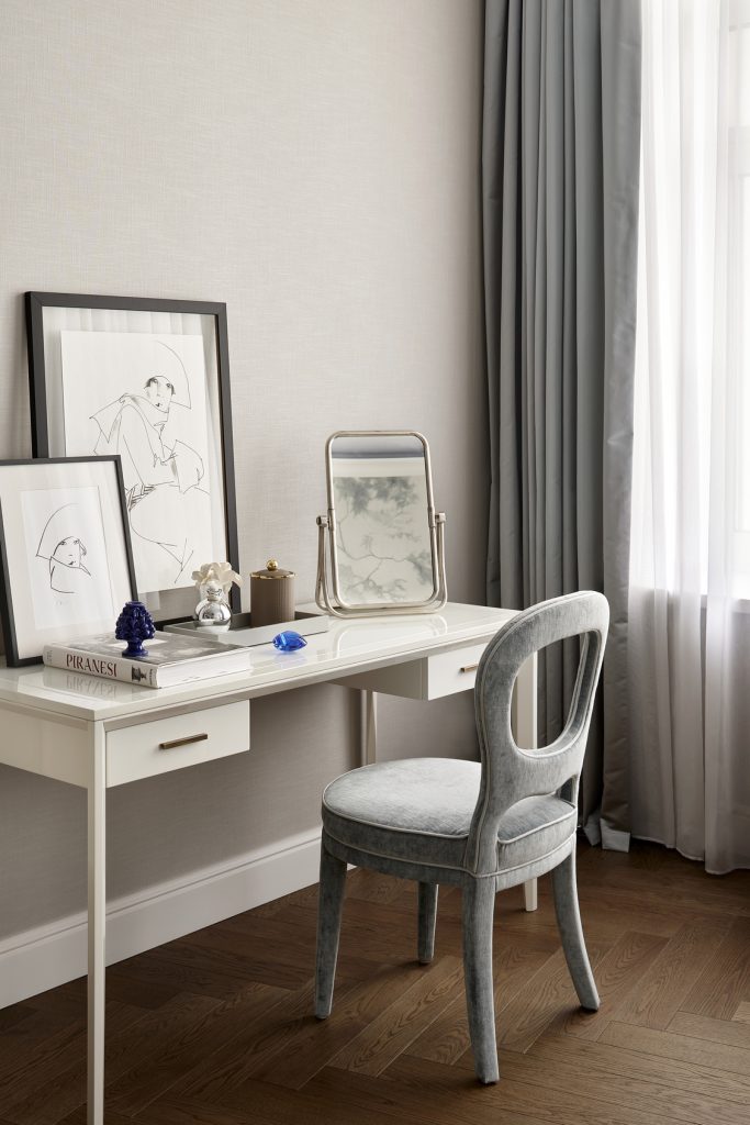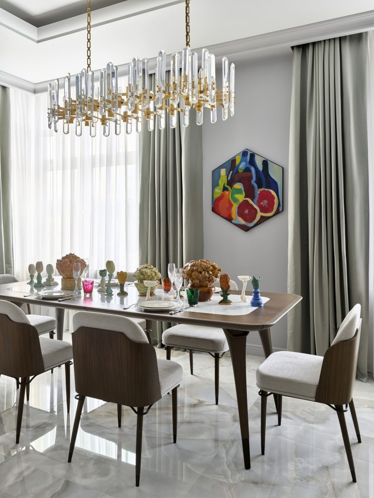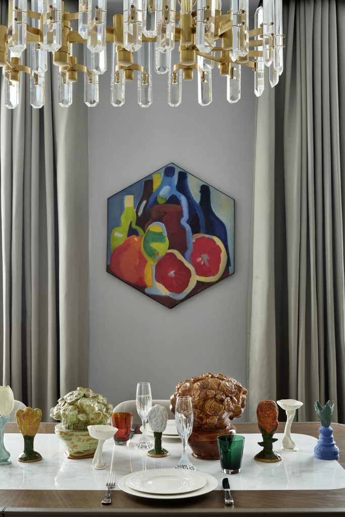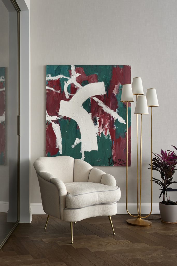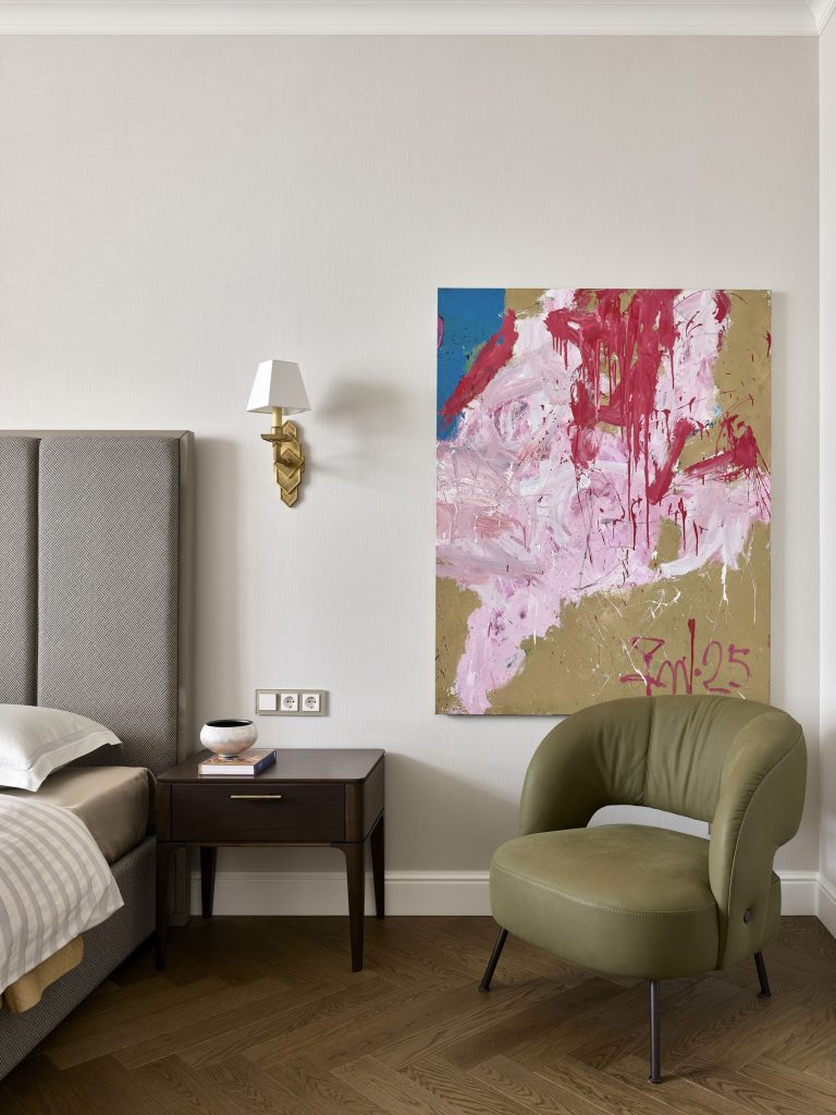 Так, например, в спальне, где царит атмосфера таинственного туманного сада, появляется драматический акцент в виде тёмной каскадной люстры. А в уравновешенный интерьер с мотивами строгого и респектабельного ар-деко врывается авантюрное и яркое современное искусство.