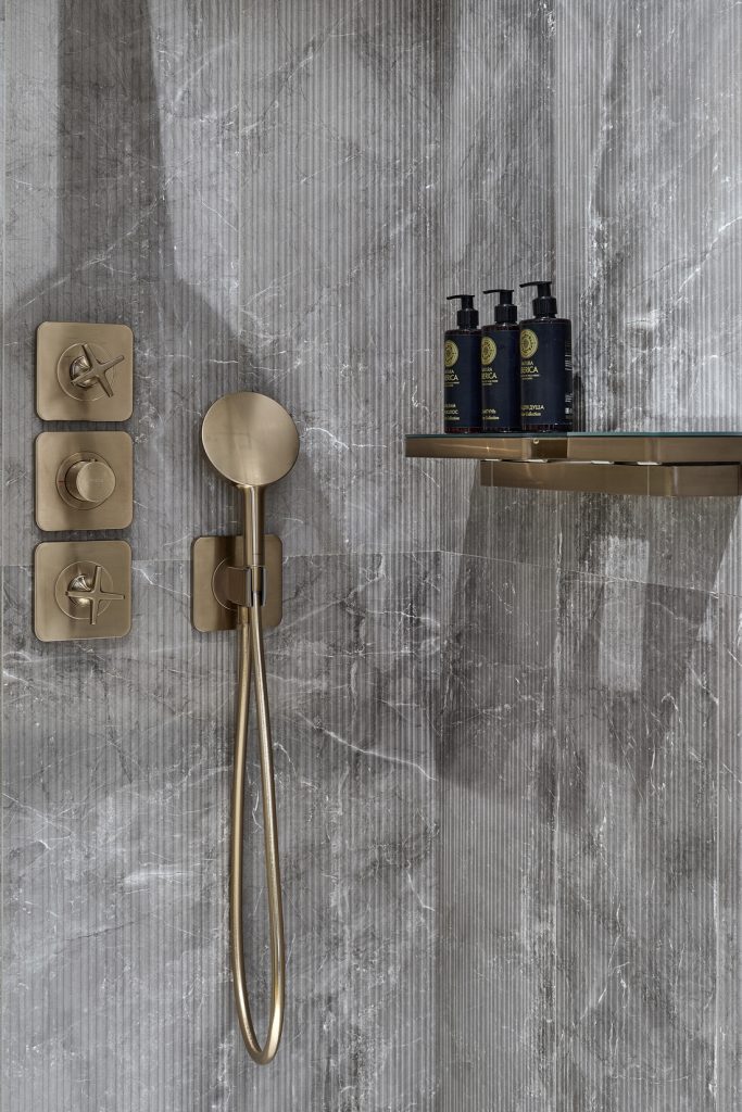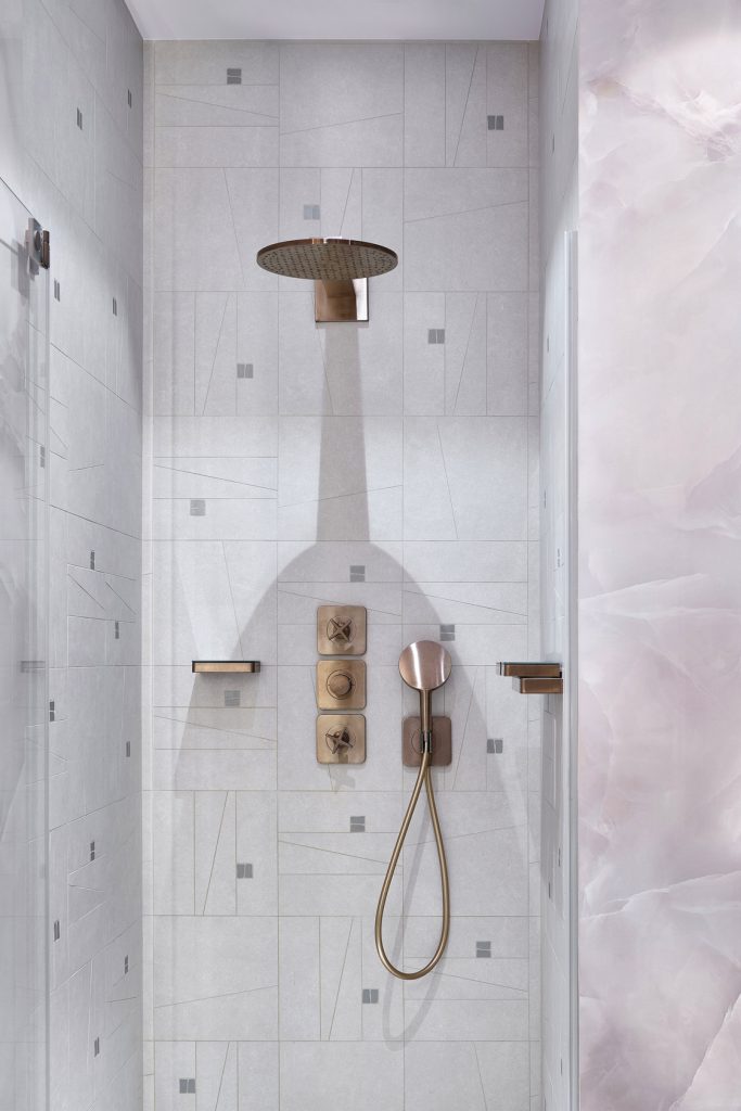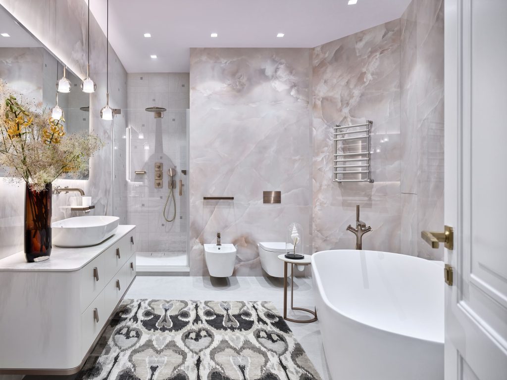 Основной санузел также задал автору проекта непростую задачу — сложная геометрия пространства требовала особого подхода. Но дизайнер не просто отлично справилась с зонированием помещения, а ещё и наполнила интерьер нотами особой элегантности и роскоши.