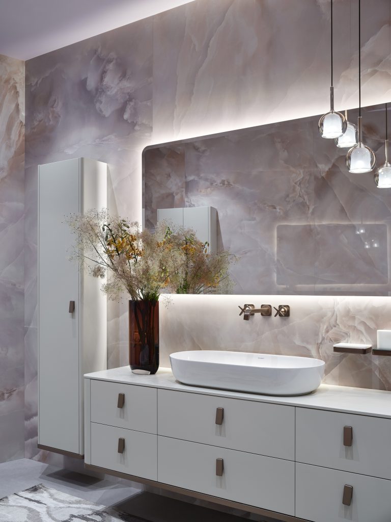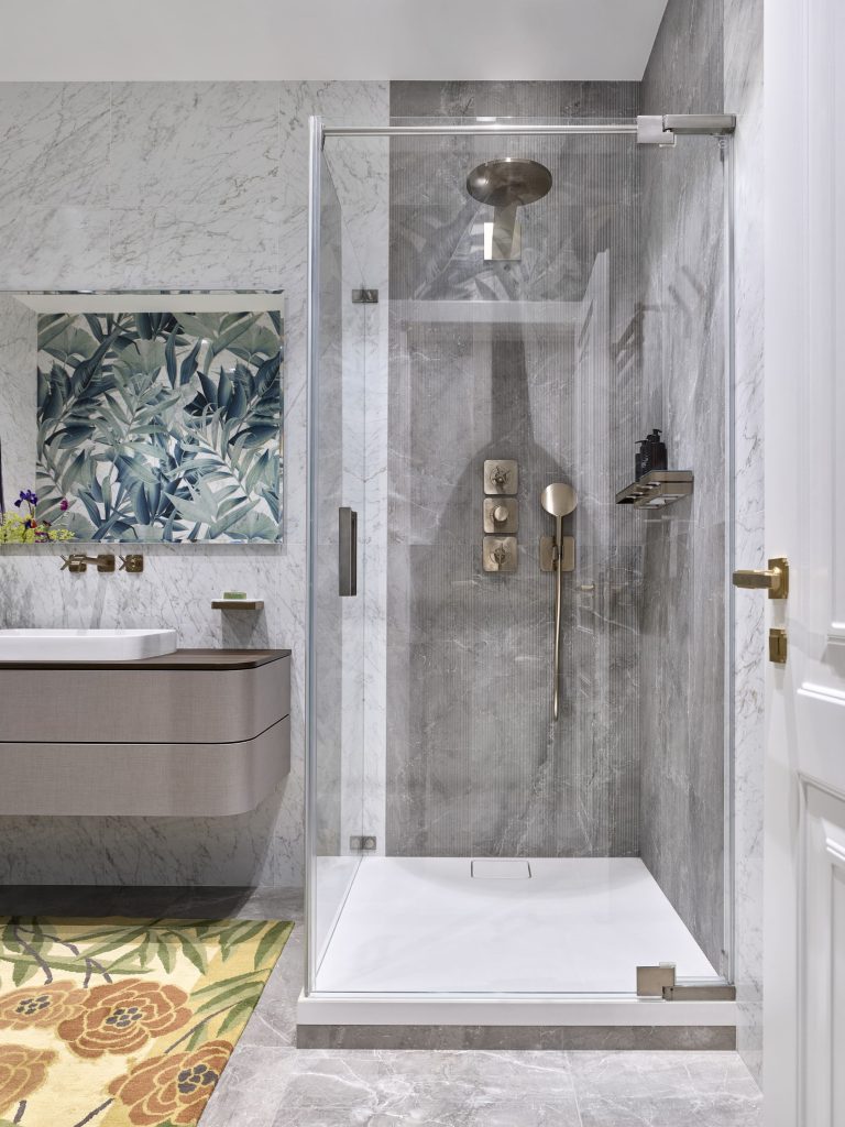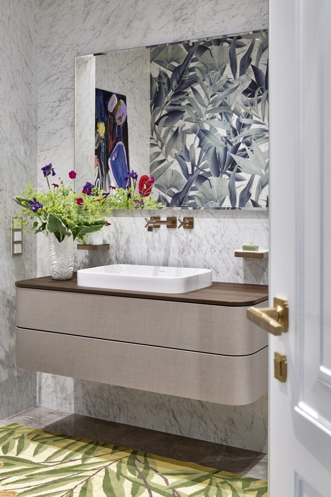 Нетривиальное решение — ковёр в ванной — Марина Жеренко объясняет так: «Дизайнеры смотрят на многие вещи более смело, но не стоит считать нас непрактичными — мы всё продумываем. Окончательный выбор за заказчиком, но хочу посоветовать всем не бояться переходить на новый уровень жизни и позволить себе жить красиво!»
