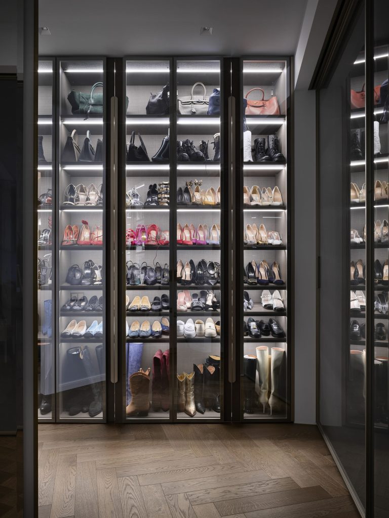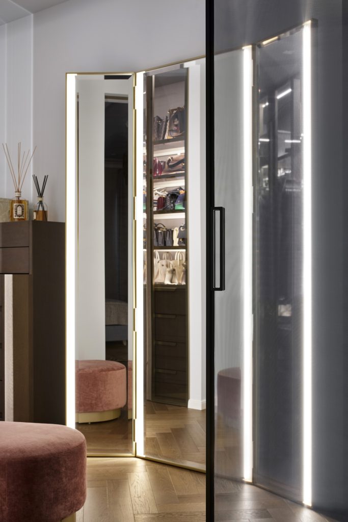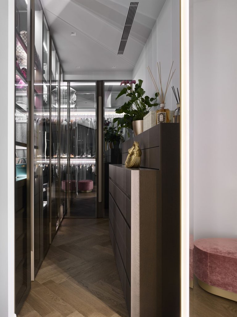 Насыщая интерьер эмоционально заряженными деталями, которые воздействуют на все органы чувств и создают уникальную атмосферу, Марина Жеренко ни на секунду не упускает из виду и практические вопросы. Например, при мастер-спальне предусмотрели великолепно продуманную и очень стильную гардеробную.