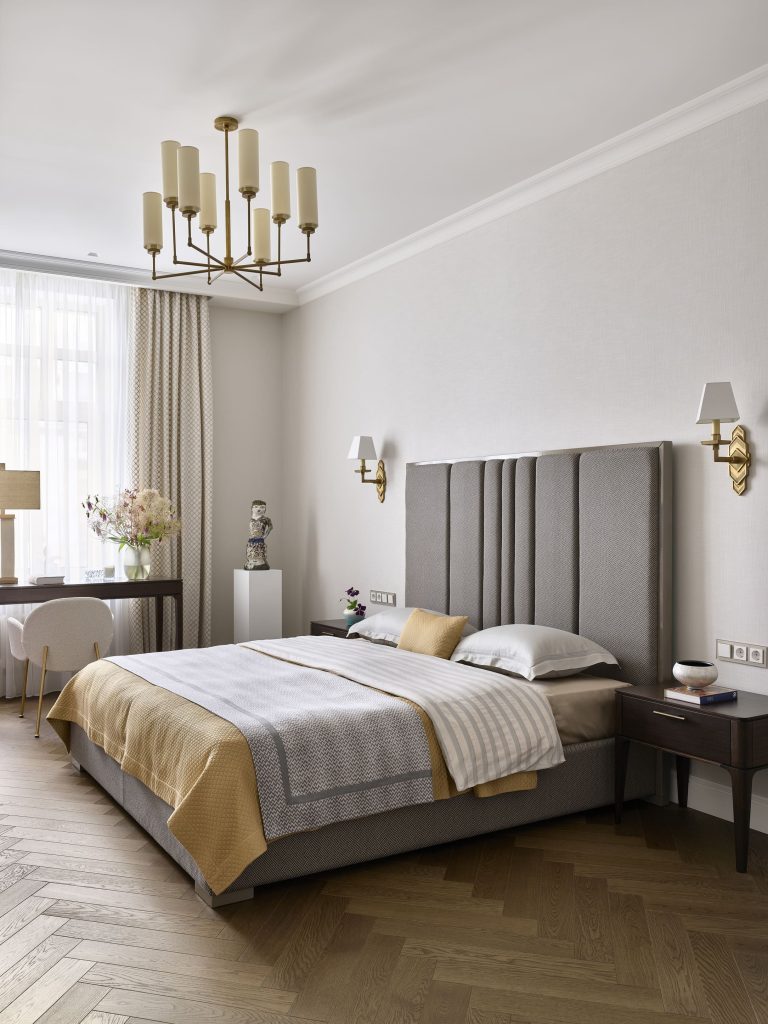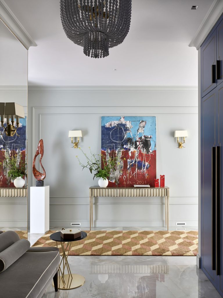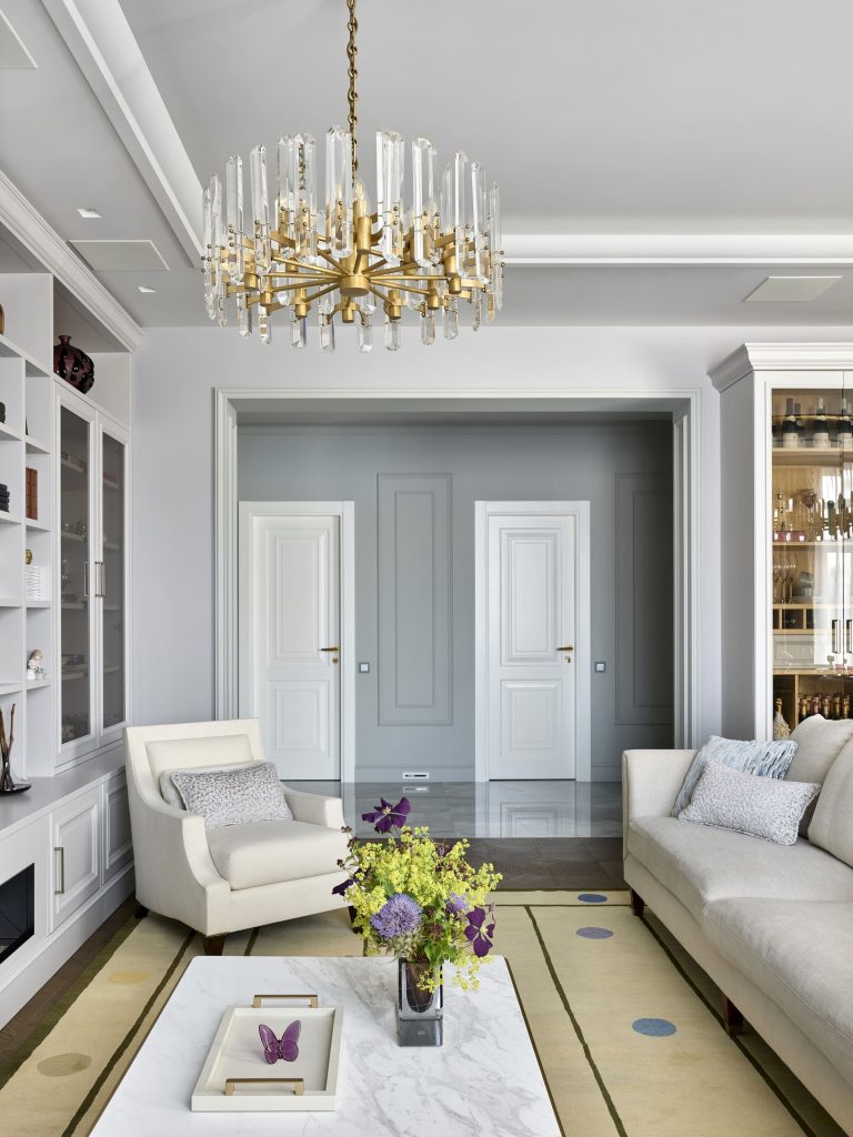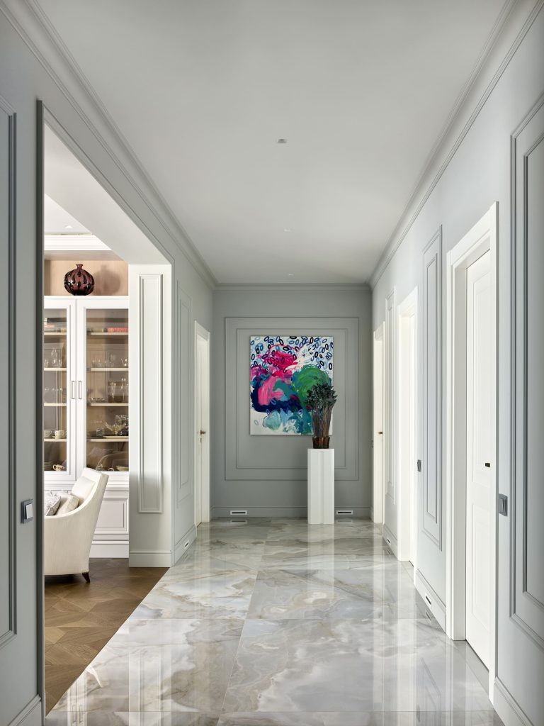 Дизайнер не боится театральных приёмов и подчёркнутой парадности, она умеет подавать классические мотивы легко и непринуждённо. В интерьере отчётливо ощущается аристократический флёр: благородный серый оттенок, большие окна, широкие проёмы, ёлочка на полу…