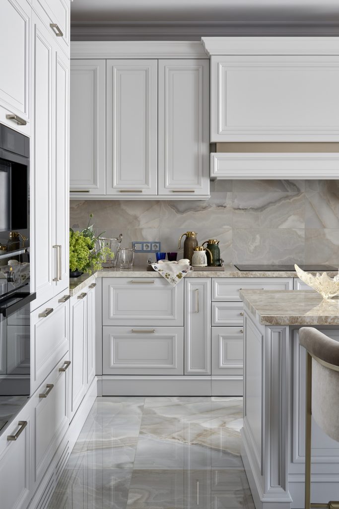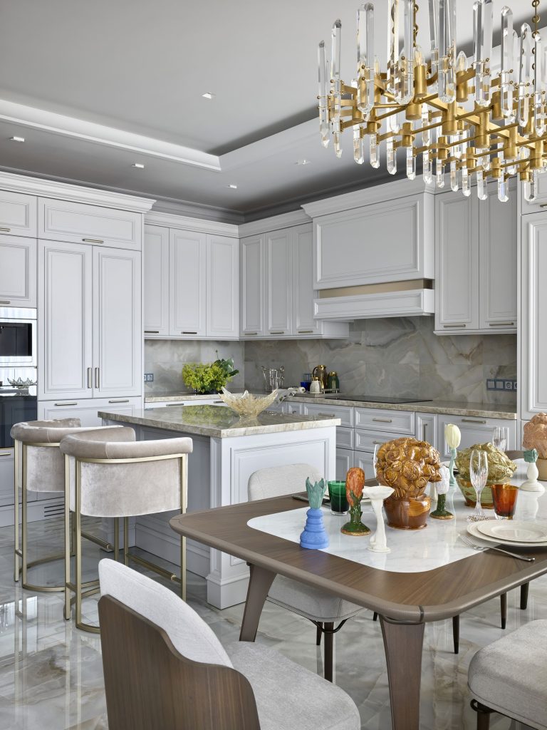 Марина Жеренко любит яркие пространства и виртуозно работает с их наполнением: грамотно и гармонично компонует отделку, фактуры, цветовое и декоративное решение, добиваясь цельности и сыгранности каждой детали интерьерного ансамбля. Так и в этом проекте в светлой и сияющей кухне-гостиной появилось множество сочных акцентов в виде декора и современного искусства, на которых хочется остановить взгляд.