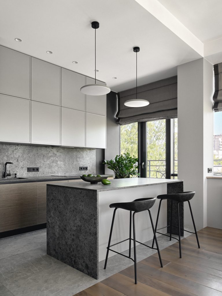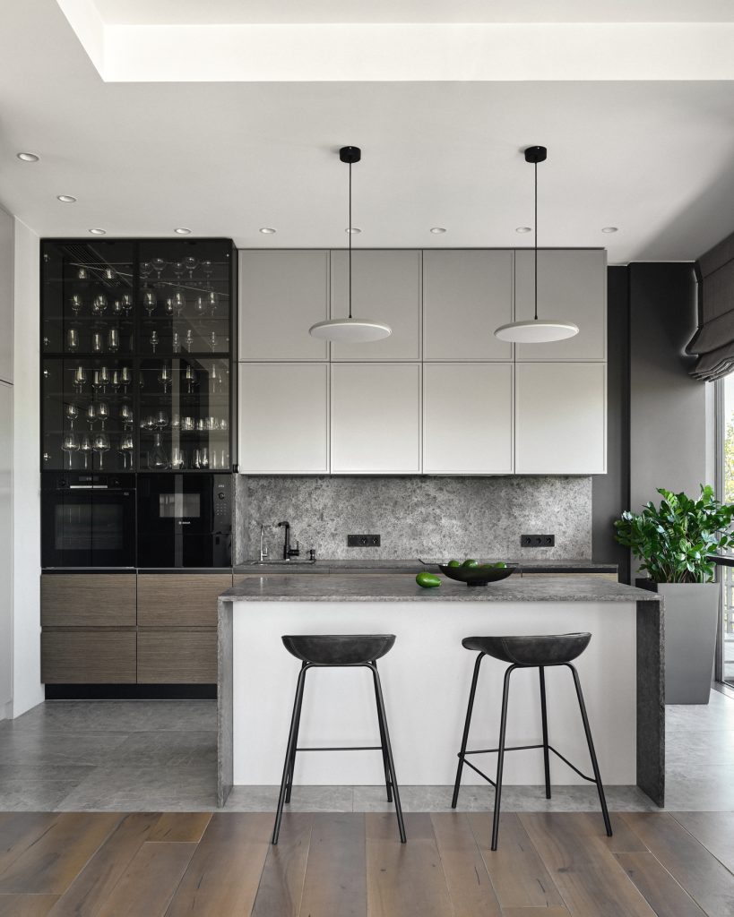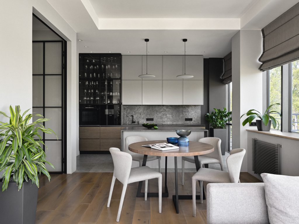 Кухонный уголок притягивает взгляд аккуратностью оформления и идеальной компоновкой техники, способствующей максимальной эффективности использования пространства. Стеллажи скрытые в стенах создают иллюзию легкости и свободы, освобождая полезную площадь от нагромождения предметов.