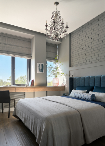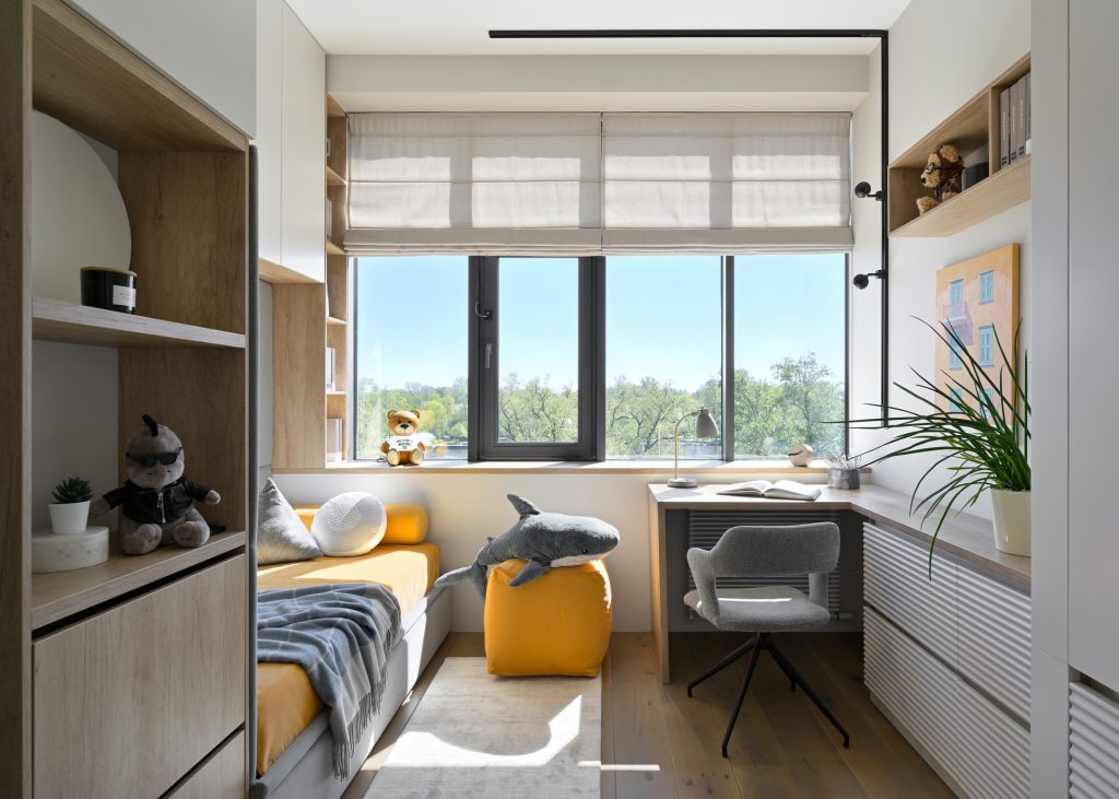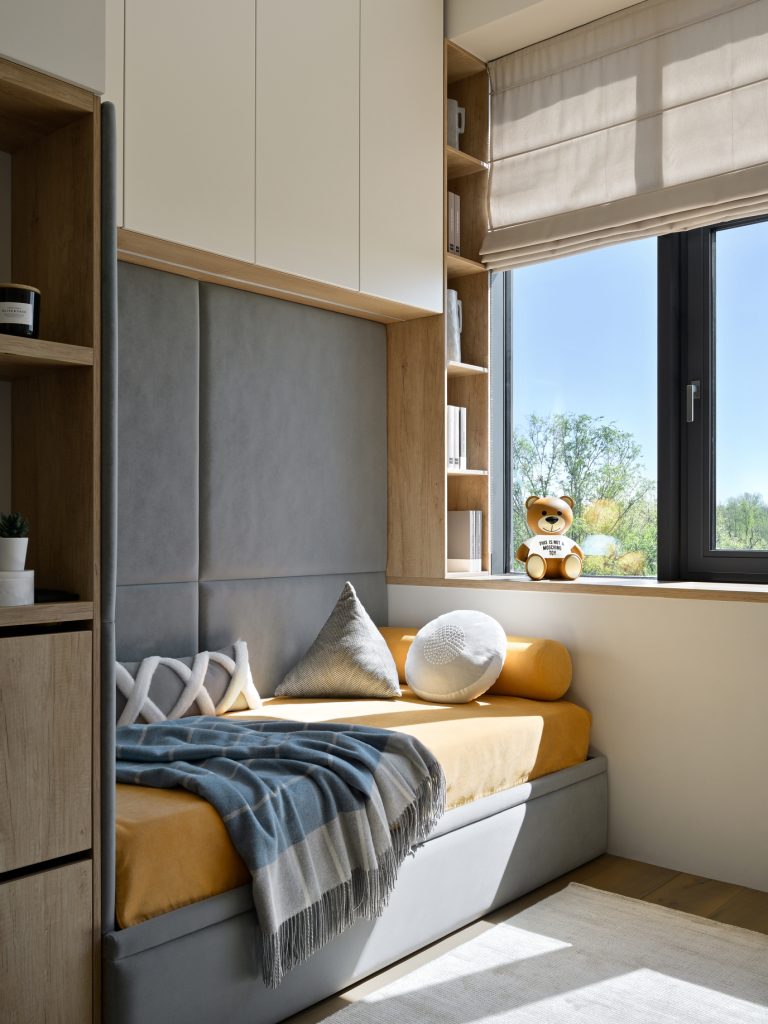 Для управления естественным освещением использованы современные римские шторы ручной регулировки, позволяющие эффективно контролировать уровень дневного света. Безопасность обеспечена специальными замками на окнах, исключающими риск случайного открытия ребёнком. Таким образом, детская комната стала не только удобной и красивой, но и безопасной зоной для полноценного проживания малыша.