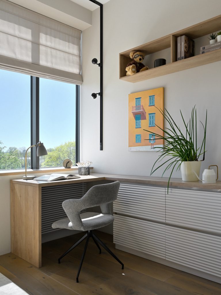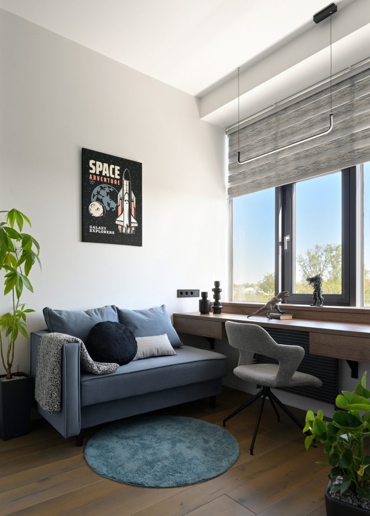 Здесь предусмотрена удобная мебель и дополнительное освещение, которое регулируется благодаря установленным на потолке трековым светильникам. Это решение даёт возможность менять интенсивность и направление света, обеспечивая комфортные условия для занятий и творчества.