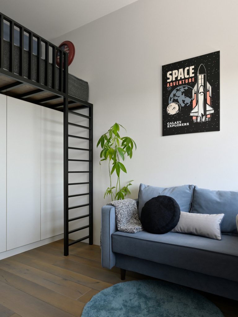 Основное внимание уделено организации мест хранения и созданию комфортного спального уголка. Ящики и полки размещены так, чтобы ребёнок свободно добирался до нижнего уровня, развивая самостоятельность и ответственность.