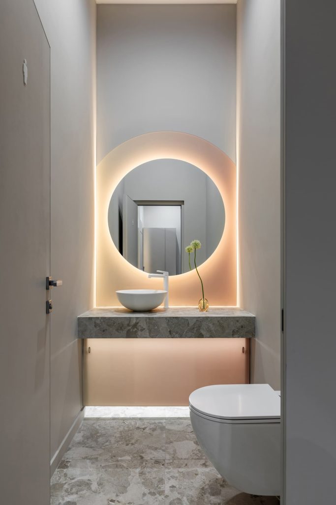 Ещё один инструмент, помогающий дизайнеру создать пространство, в котором посетители смогут расслабиться, забыть о ежедневных заботах, сосредоточиться на собственных ощущениях и насладиться заботой о себе, — это выверенные сценарии освещения. Необходимый для подобных интерьеров технический свет Марина Безух дополнила рассеянной подсветкой. Подсвеченный логотип на ресепшене, мягкое свечение круглых зеркал — такие элементы усиливают атмосферу камерности.