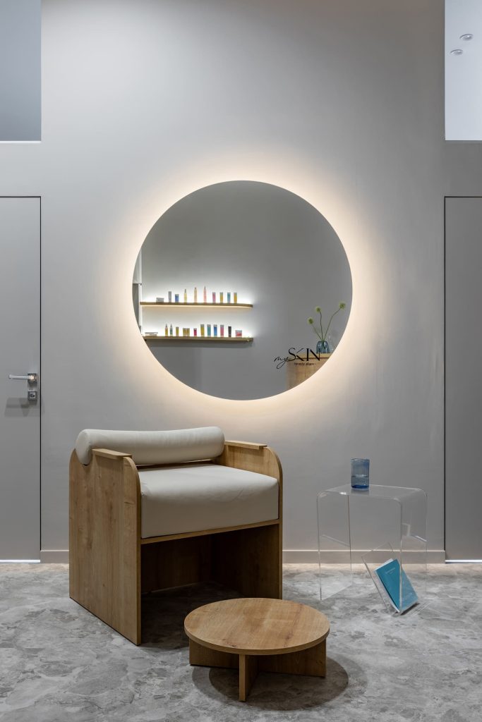 В My skin предлагают множество услуг по уходу за собой, и одной из самых востребованных является депиляция, да и начинала владелица салона именно как мастер в этой сфере. Поэтому у Марины Безух появилась идея отразить этот аспект через интерьерные средства. Так в пространстве появились подчёркнуто гладкие фактуры, обтекаемые формы, плавные чистые линии, за которыми хочется следить взглядом, не цепляясь за острые углы. Такое визуальное наполнение будет ассоциироваться у посетителей салона с безупречным результатом и с нежной заботой об их теле. Той же цели способствует и колористика: светлые тона обволакивают и успокаивают, а акцентное включение тёплой фактуры дерева не позволяет заскучать.