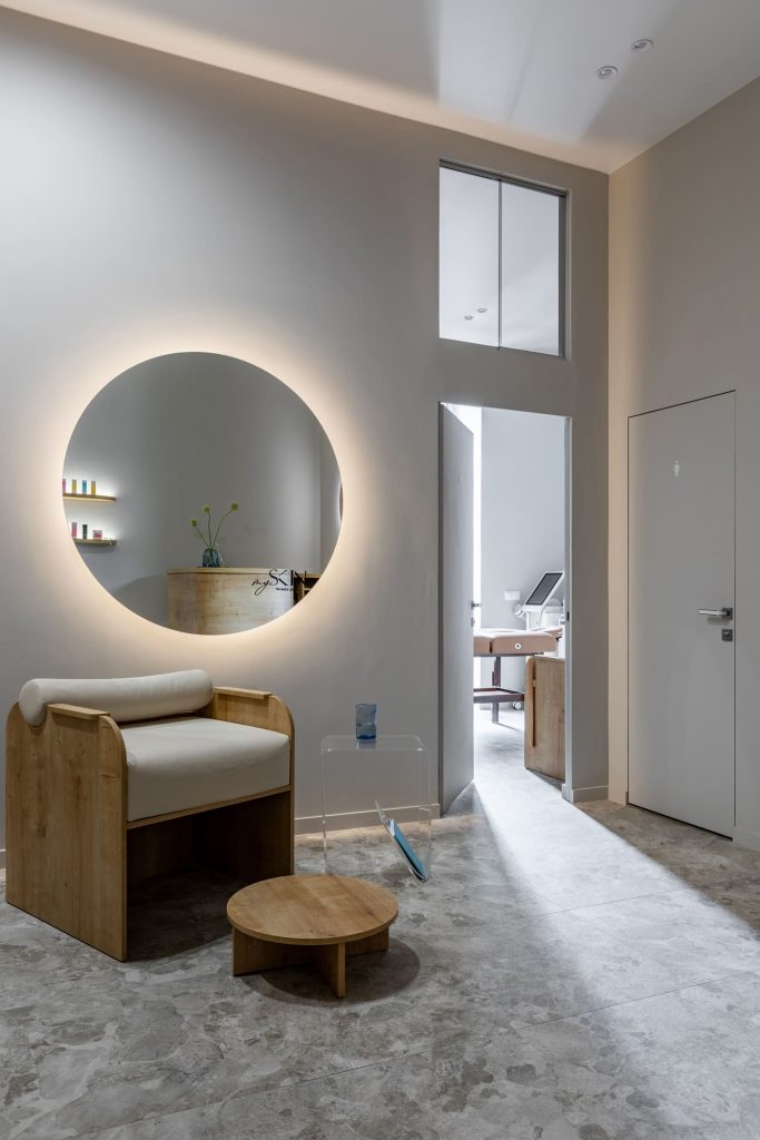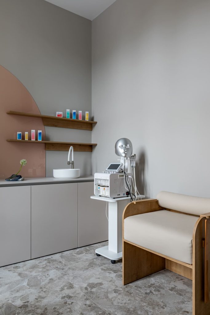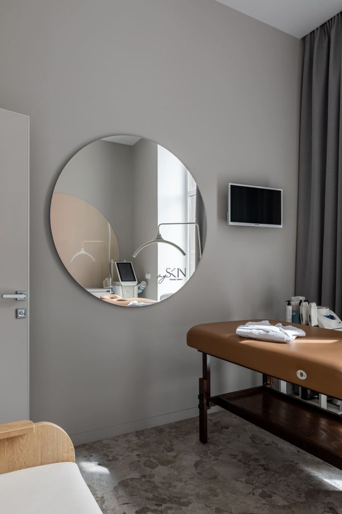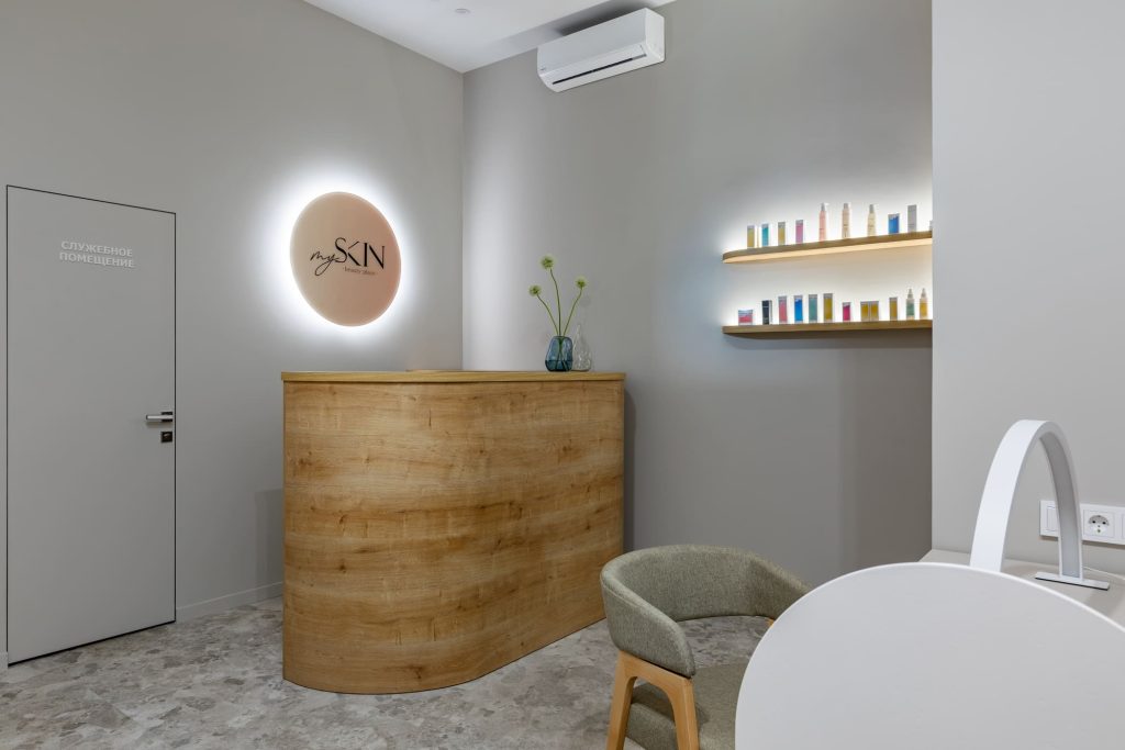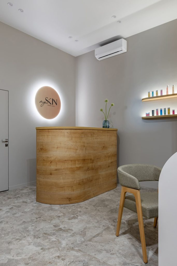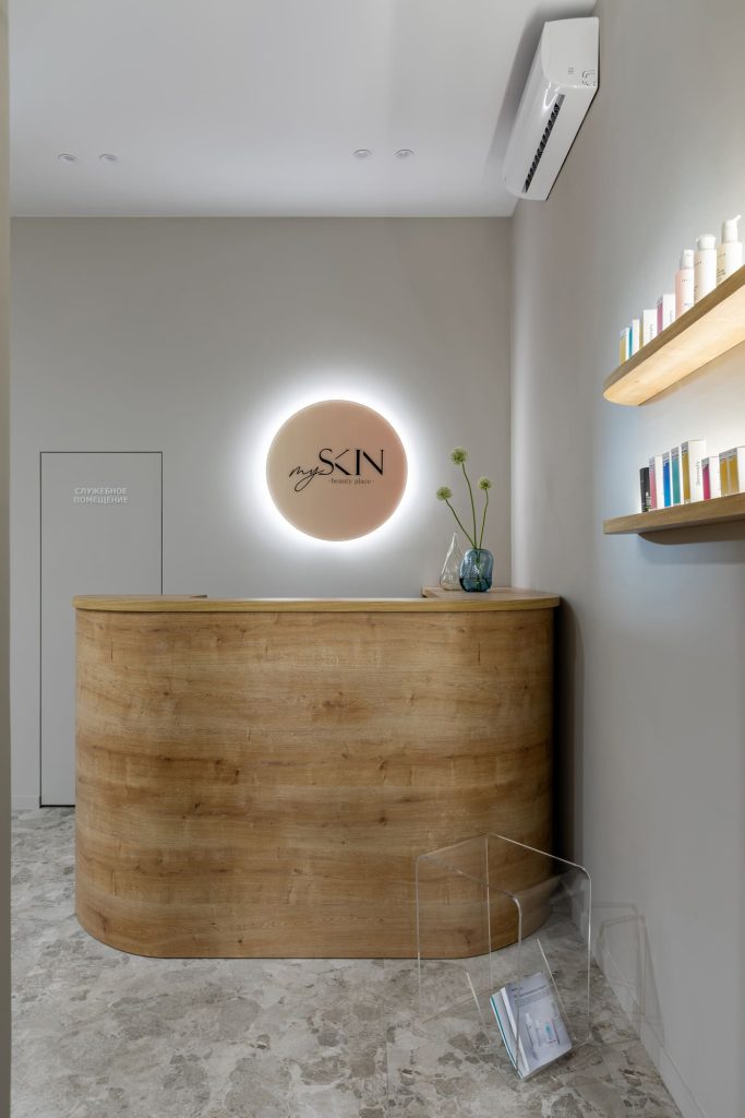 Некоторые интересные идеи возникли оттого, что требовалось найти бюджетные решения без ущерба для удобства клиентов. Так, например, два окошка над входом позволили не устанавливать дополнительный кондиционер. Это пошло на пользу проекту: в пространство впустили больше естественного света, обеспечили циркуляцию воздуха, а высокое расположение окошек не нарушает приватность клиента. А клиентов, без сомнения, у My skin скоро будет ещё больше: ведь в этом гостеприимном и современном пространстве так легко найти заботу, внимание и бережную бьюти-поддержку.