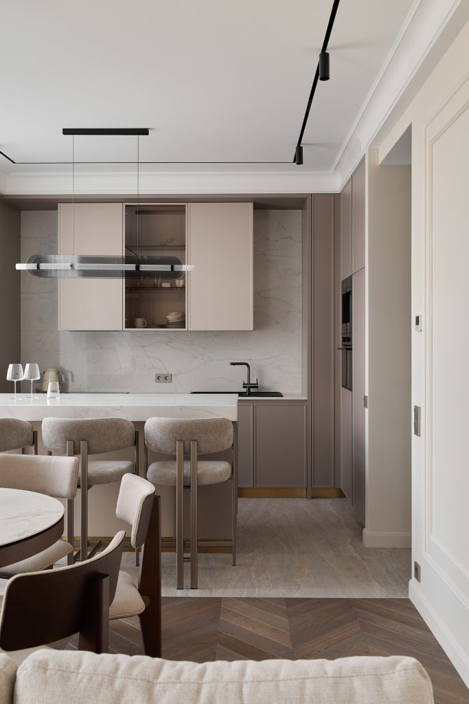 Геометрия пространства выдержана чётко и ясно. Никаких сложных форм и асимметричных решений — каждая линия продумана и проста. Минимализм проявляется и в выборе мебели, которую выбирали вместе с заказчиком. Она отличается лаконичностью форм, отсутствием излишних деталей и удобством эксплуатации.