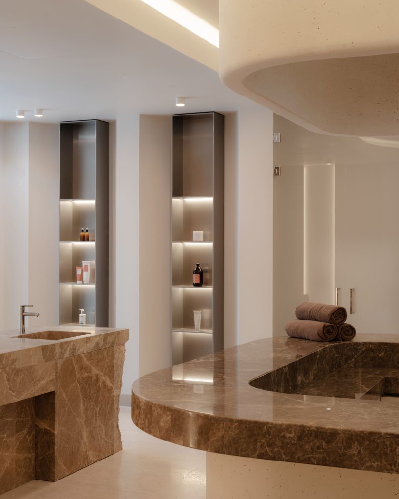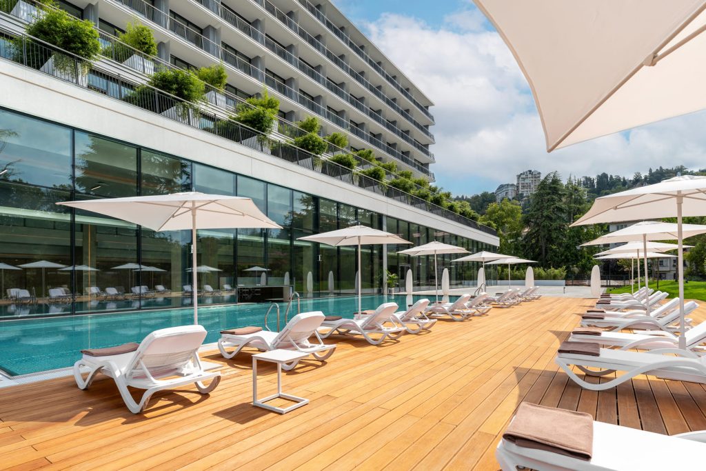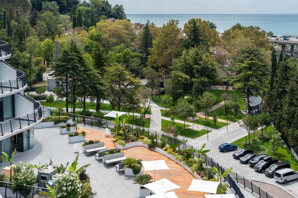 Комплекс спроектирован таким образом, чтобы стать продолжением природного окружения. Изогнутые линии фасада напоминают очертания горных склонов, плавно переходящих в морской горизонт.
