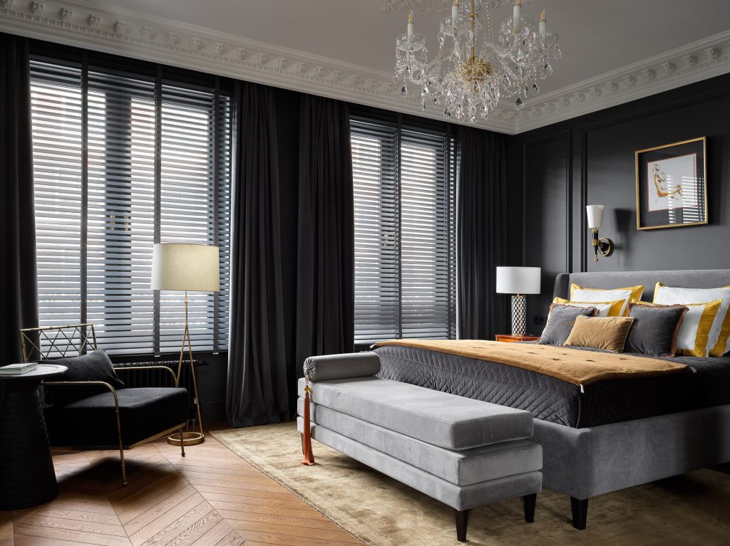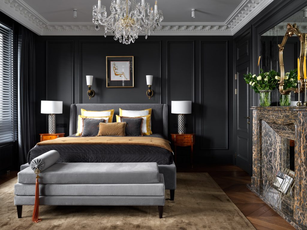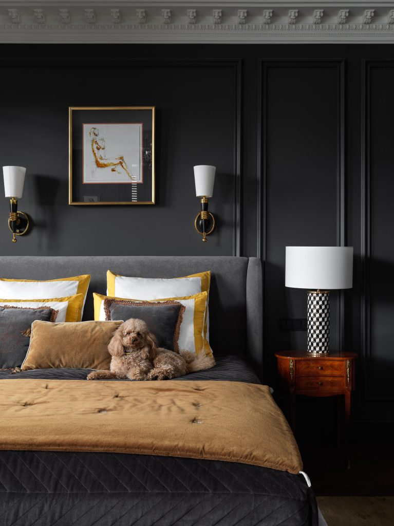 Для спальни была выбрана еще более темная база, но большое количество естественного света позволяет выдержать баланс и выстроить окутывающую, мягкую атмосферу.