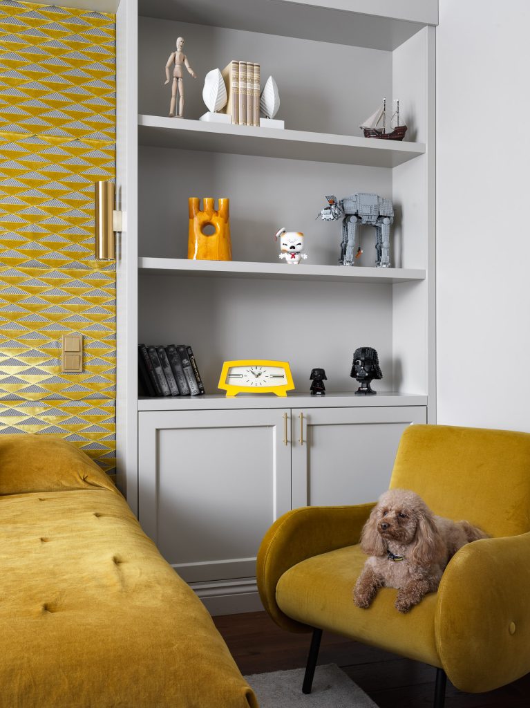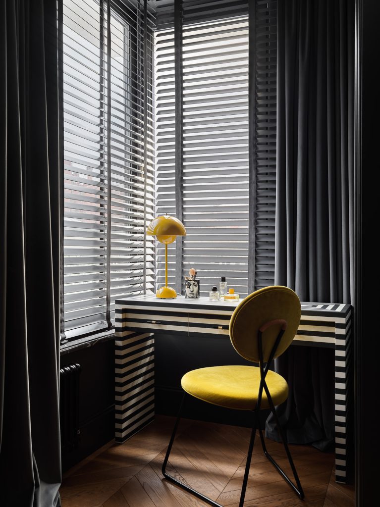 Внимание притягивает контрастный туалетный столик Roomadesign в союзе с ярким стулом от Д. Адлера.
