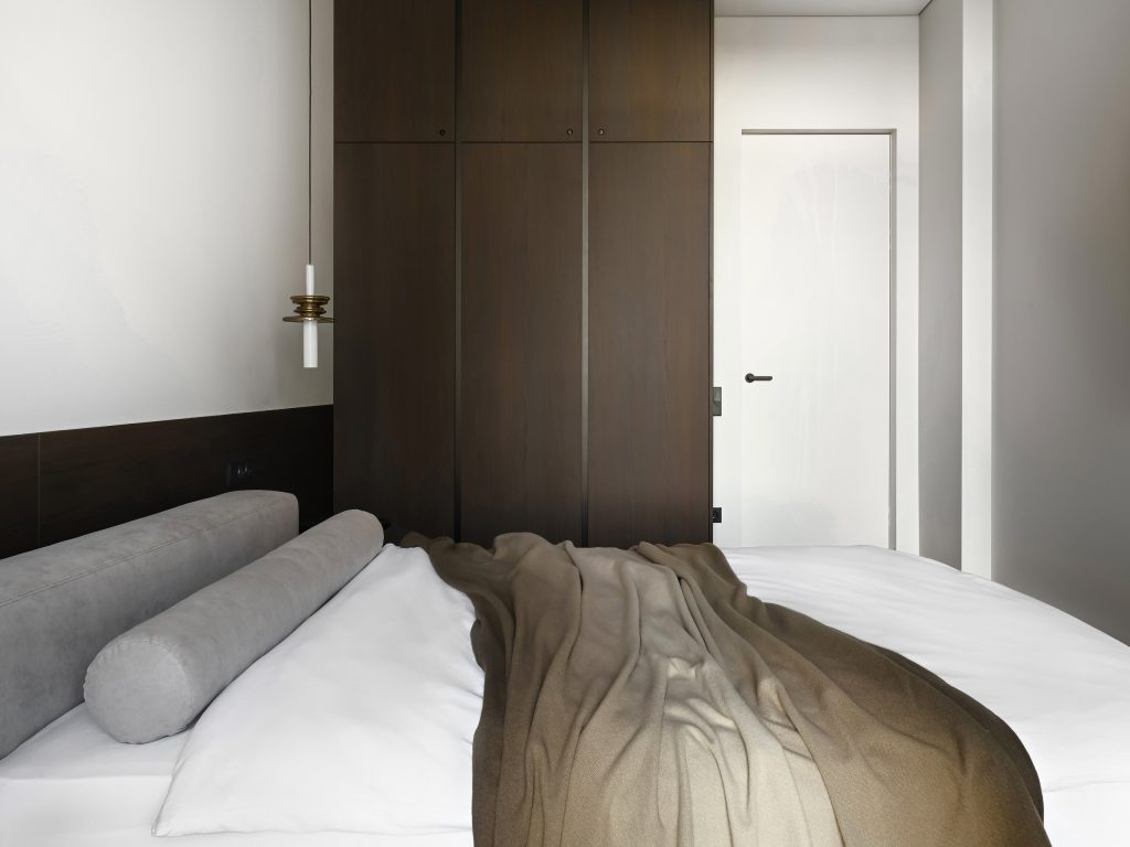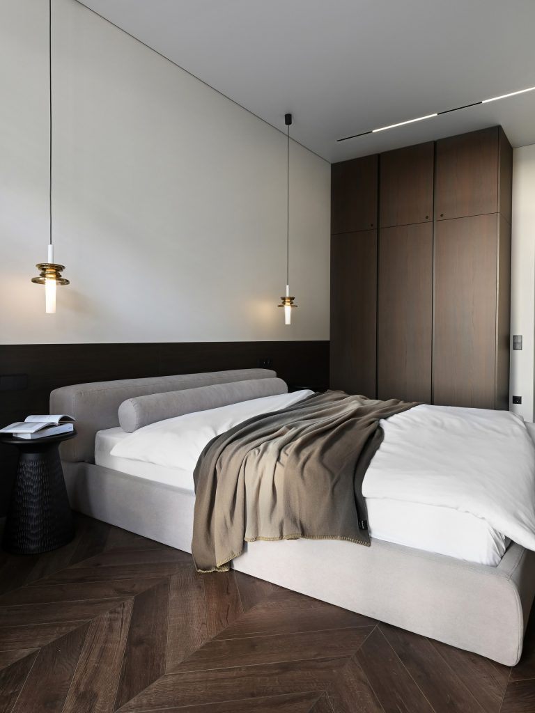 Спальня стала сердцем приватной зоны — камерным пространством, способствующим спокойному отдыху. Каждая деталь говорит сама за себя. Акцент создаёт пара подвесных светильников из цветного стекла с золотым кантом. Льняные гардины и шерстяной плед с градиентным окрасом на кровати завершают образ, построенный на атмосфере глубокого спокойствия. Стены, окрашенные в теплые тона, мягко отражают свет, добавляя объёма комнате. Шкаф из тёмного дерева с распашными дверями гармонично сочетается со светлыми стенами, сохраняя чистоту линий и делая систему хранения незаметной.