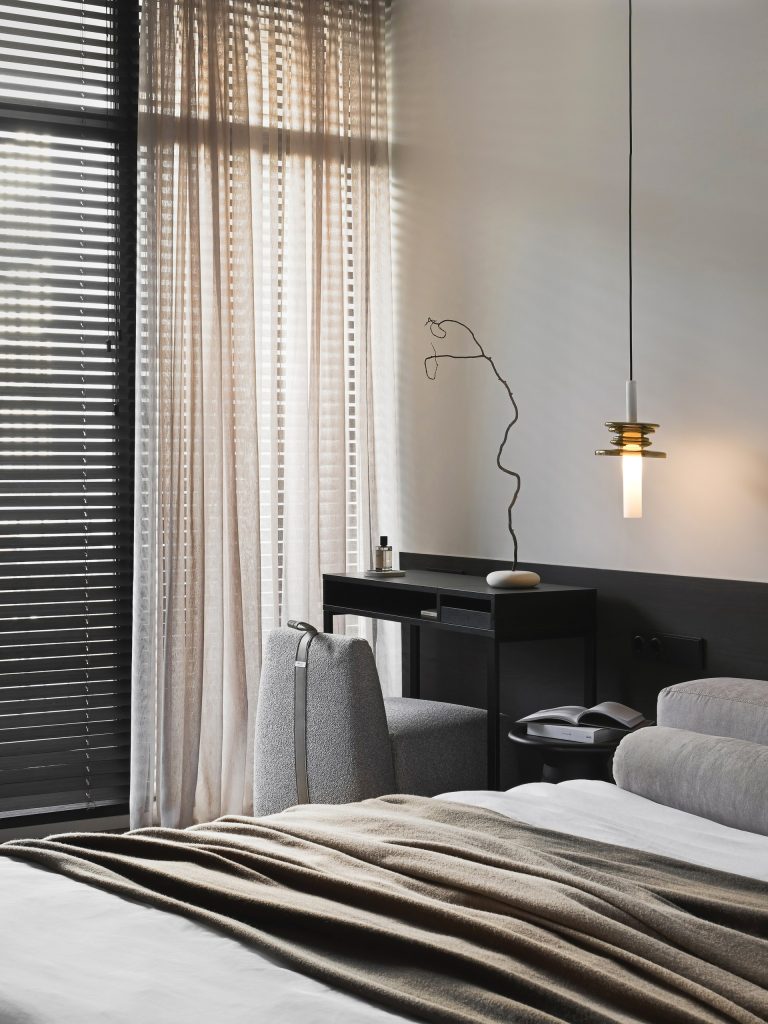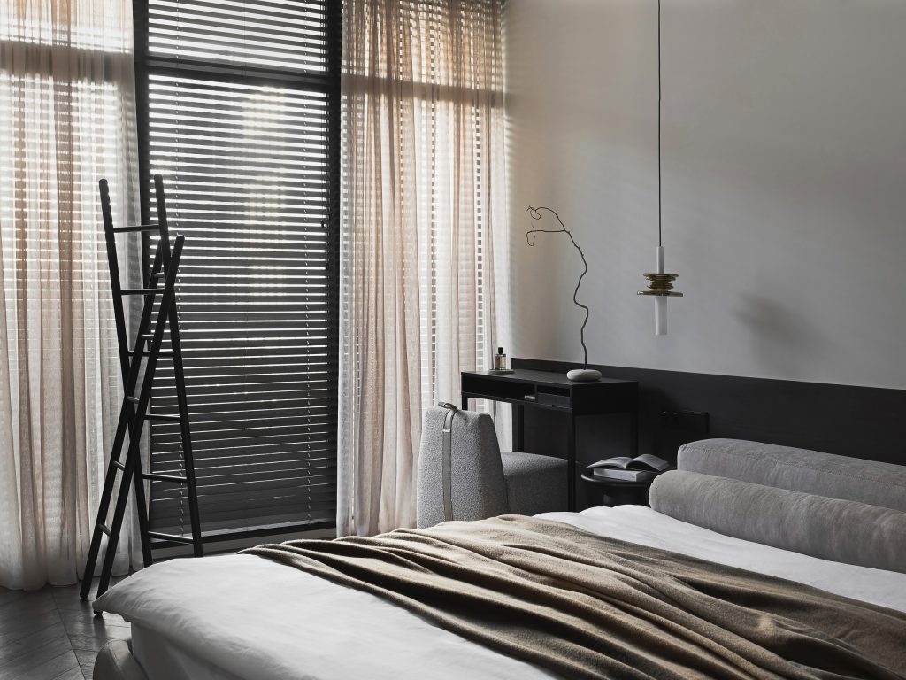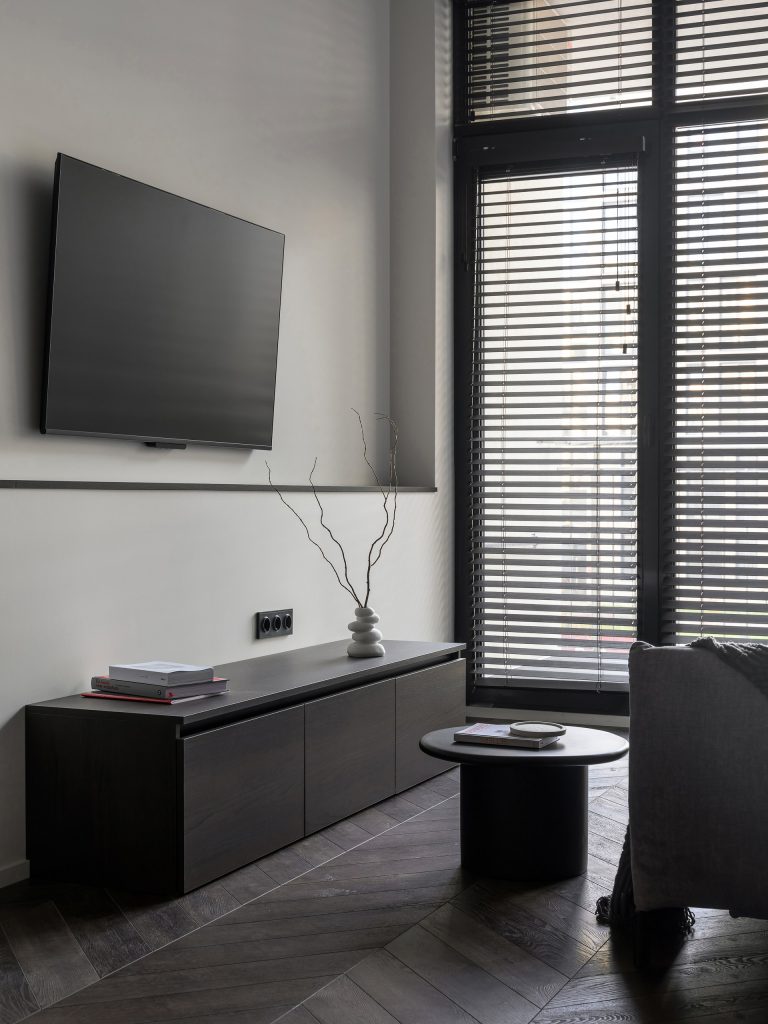 Продуманная световая архитектура создаёт настроение в течение всего дня. Направленный свет с узким углом рассеивания мягко выделяет обеденную зону по вечерам, приглашая к уединению. В светлое время суток пространство наполняется естественным светом: его блики на монохромном текстиле рождают тот самый тонкий баланс, который дарит ощущение безмятежности.
