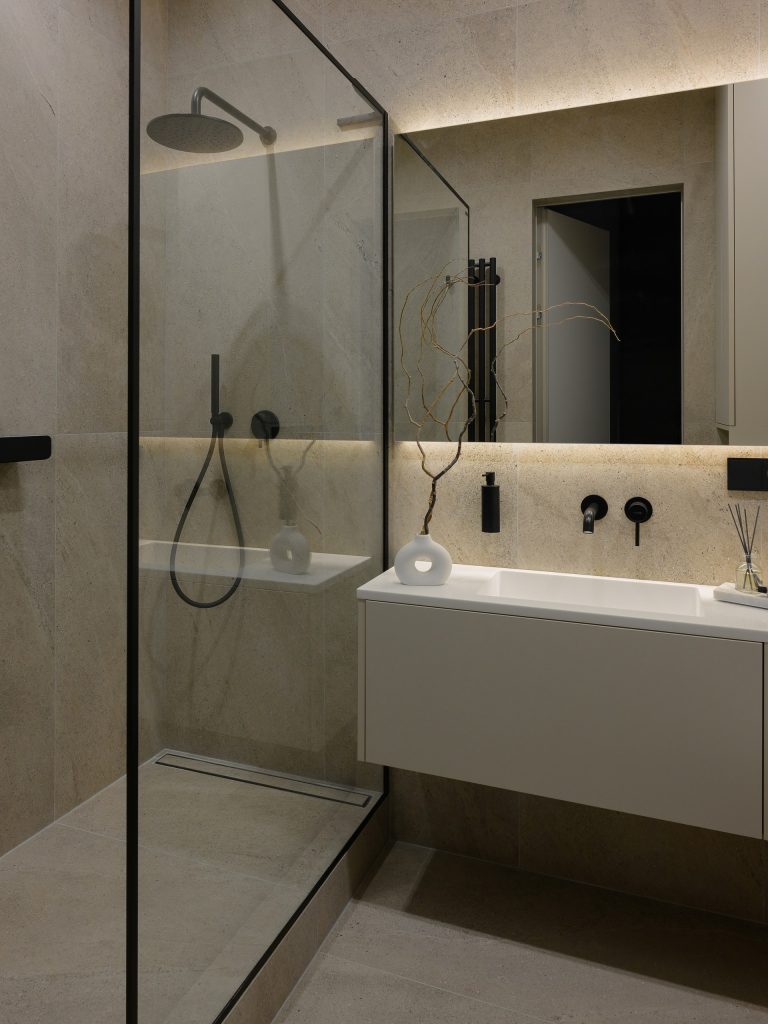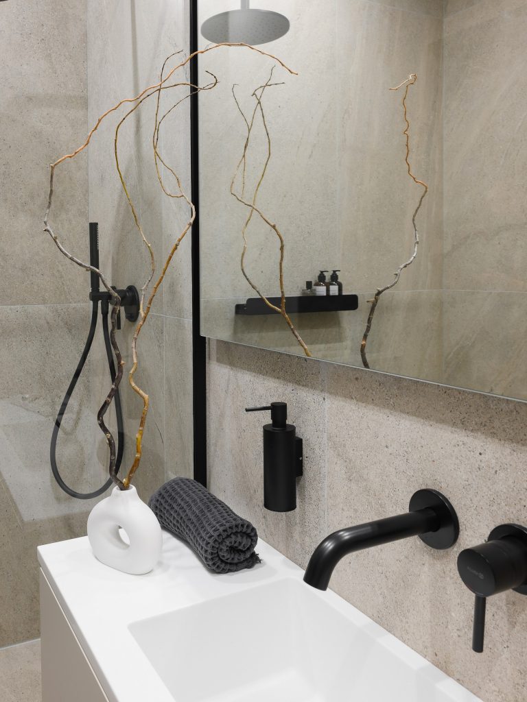 Ванная комната, выполненная в оттенках балтийского песка, передаёт атмосферу калининградского побережья. Здесь царит настроение чистоты и покоя. Стены и напольное покрытие отделаны крупноформатным керамогранитом бежево-серого оттенка. Мебель в ванной выполнена в тон плитке, что делает её незаметной и подчёркивает основной цвет. Ключевым акцентом стала душевая: достаточно эргономичная, с тропическим душем внутреннего монтажа и смесителями плавных форм в чёрном цвете. Скрытая подсветка зеркала создаёт идеальное освещение для утренних и вечерних ритуалов.
