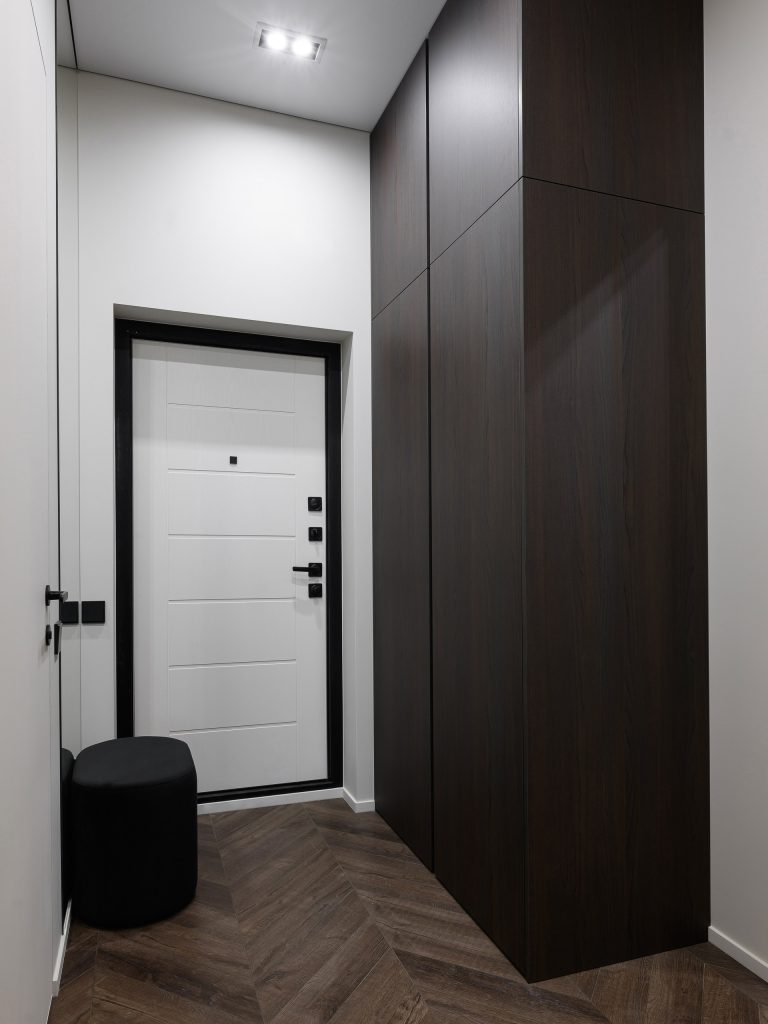 Прихожая задаёт первое и финальное впечатление от дома, выступая его визитной карточкой. Напольное покрытие из тёмного дерева сочетается со светлыми стенами, визуально разделяя пространство и делая его мягче. Система хранения тщательно замаскирована: шкаф выстроен так, что плавно перетекает в пространство кухни.