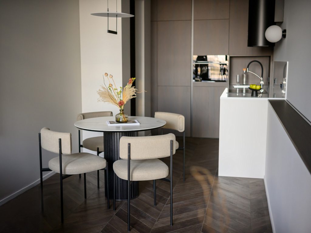 Гостиная плавно перетекает в столовую зону, где лаконичная рабочая зона кухни продолжает единое пространство. Завершающим штрихом, подчёркивающим чистоту линий и целостность пространства, стал невысокий тонкий плинтус, окрашенный в тон стен.
