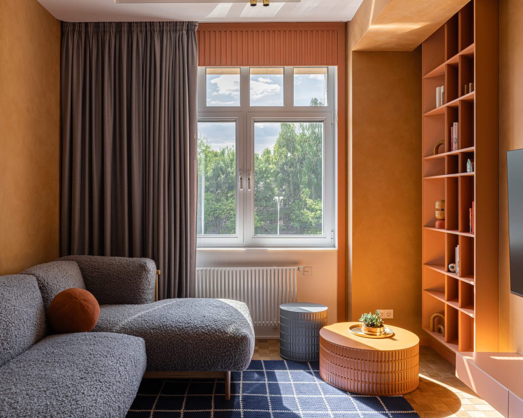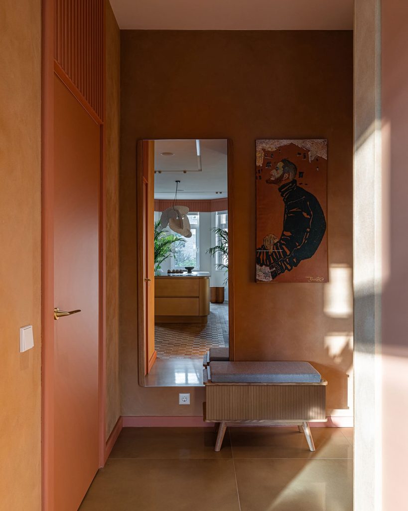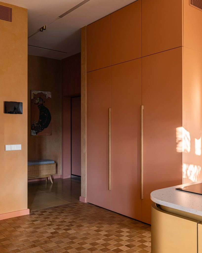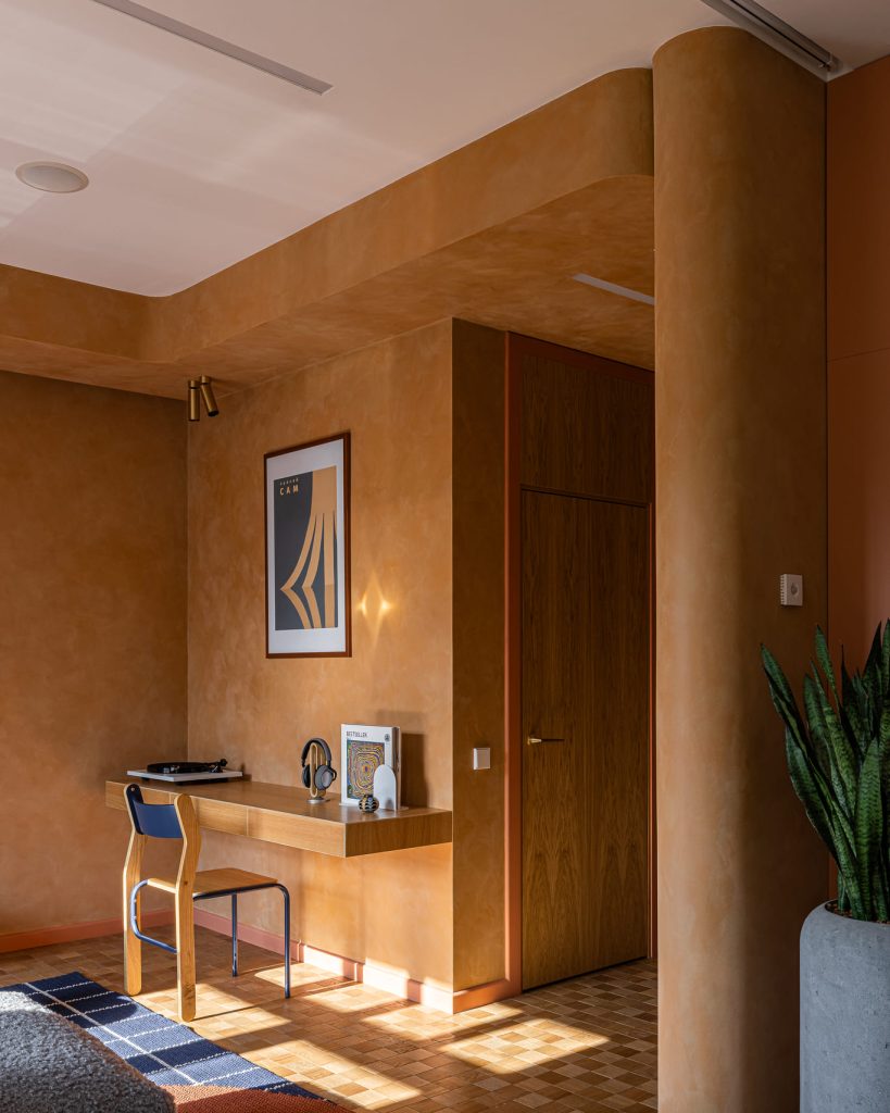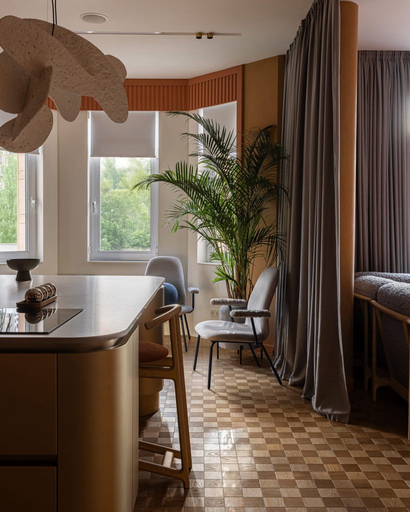 Дизайнер отдала дань и советскому модернизму, и принципам Баухауса, создав мягкое, перетекающее пространство, вытянув дверные и оконные проёмы при помощи декоративных фрамуг и скруглив углы.