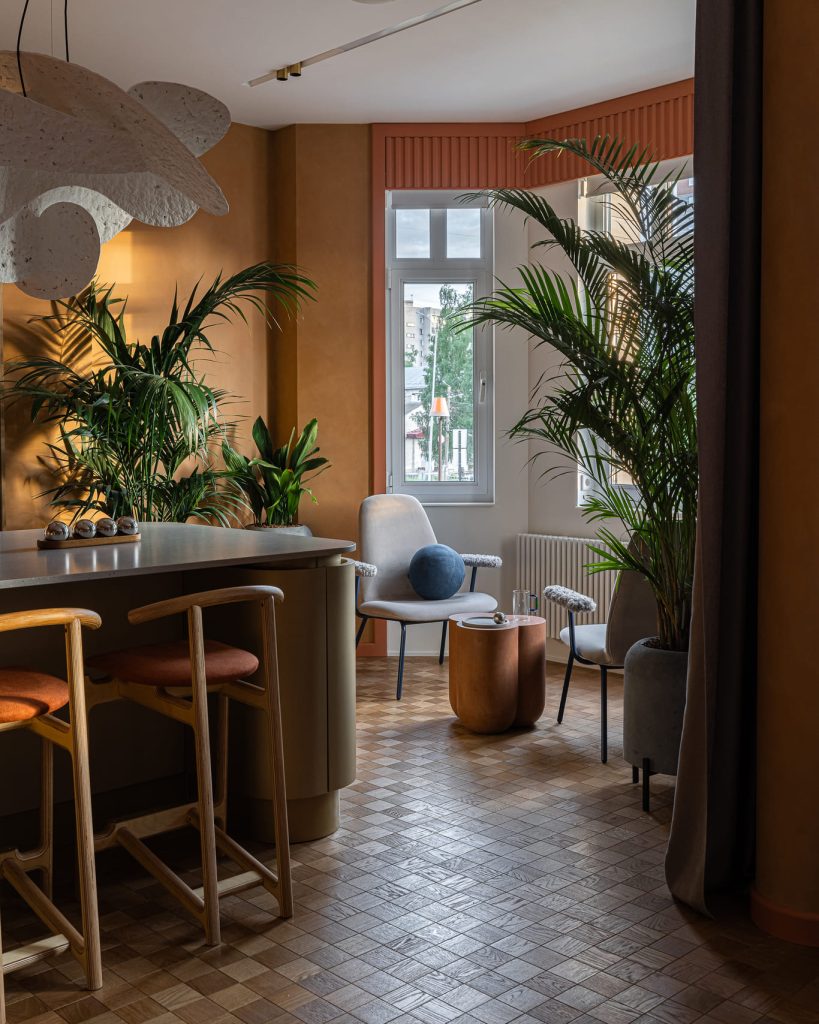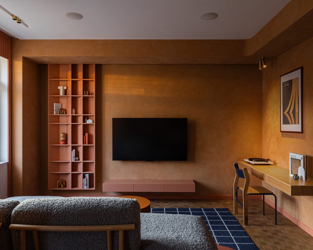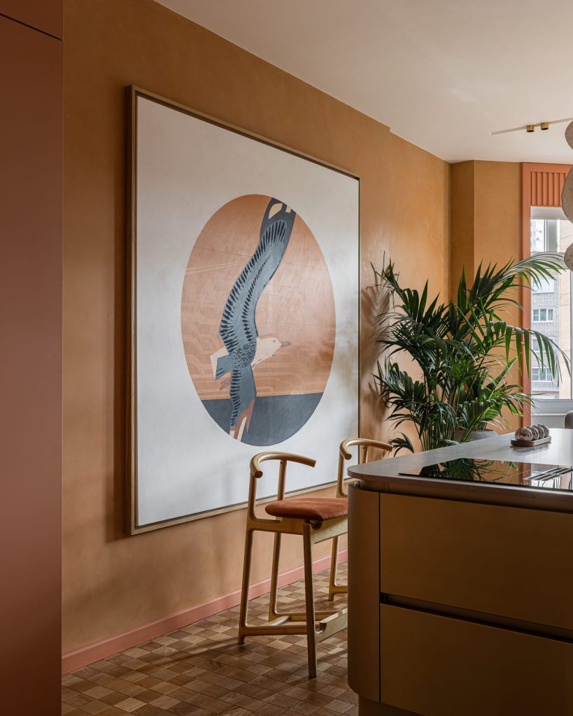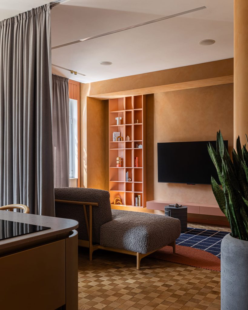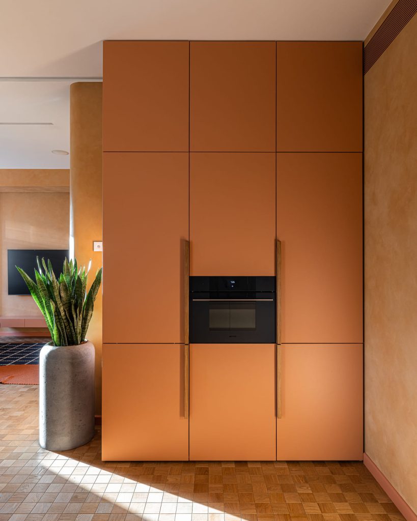 Дизайнер отдала дань и советскому модернизму, и принципам Баухауса, создав мягкое, перетекающее пространство, вытянув дверные и оконные проёмы при помощи декоративных фрамуг и скруглив углы.