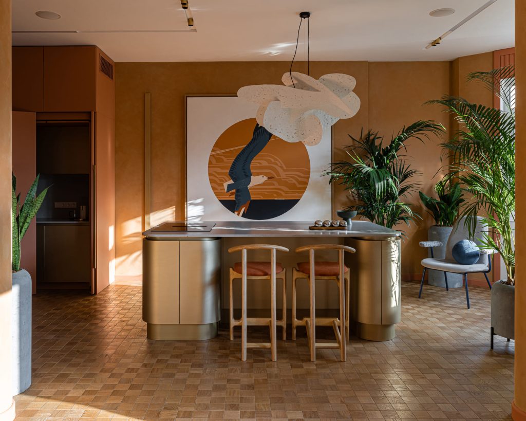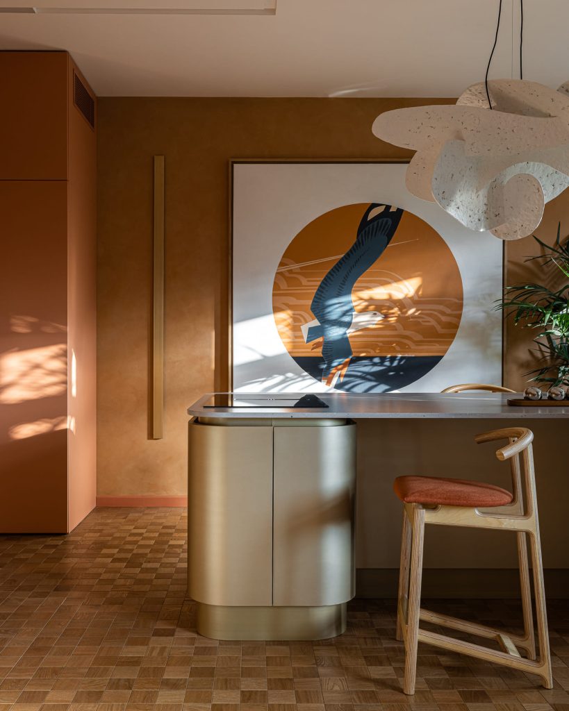 Для столешницы был выбран прочный кварц. Фасады кухни, выполненные в эмали двух цветов, лосось и латунь, интересно контрастируют с невесомой «тучкой» — уникальным светильником из переработанной бумаги. Зона эркера образовала зелёный лаунж, который на закате превращается