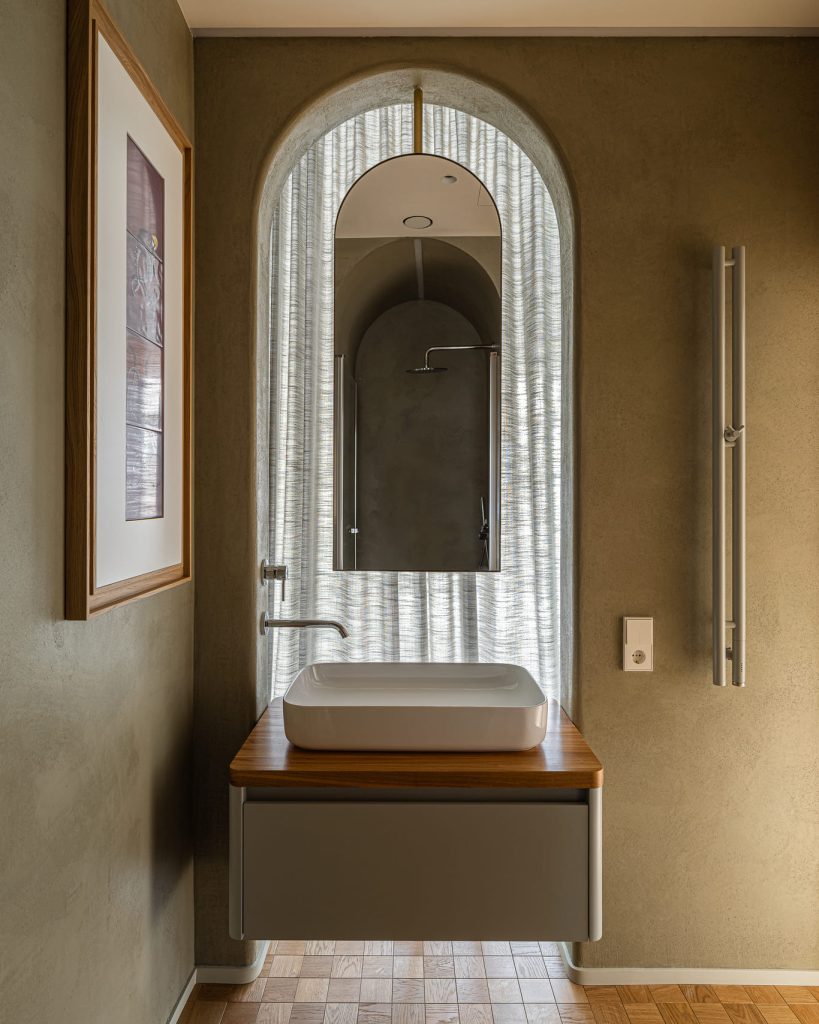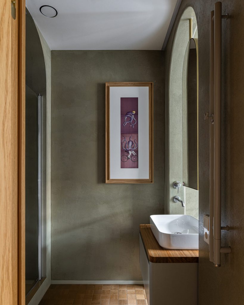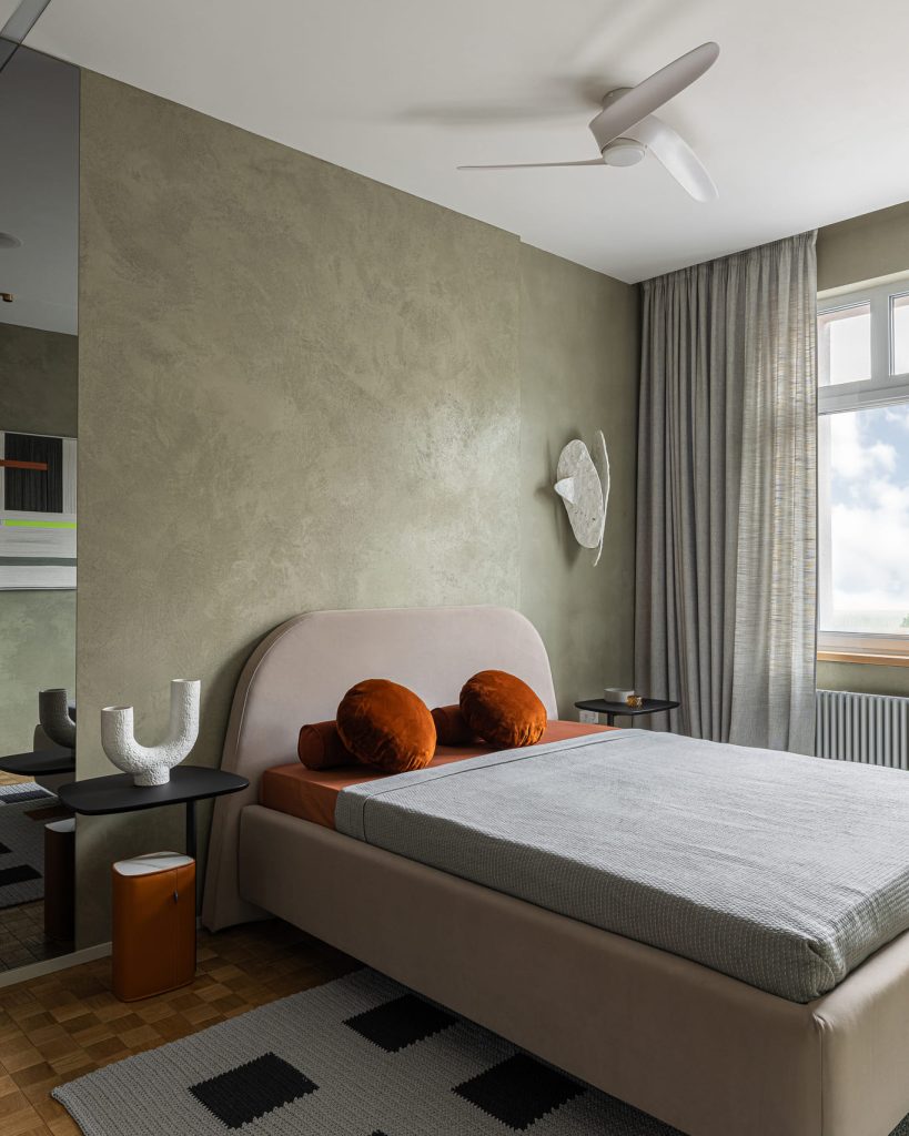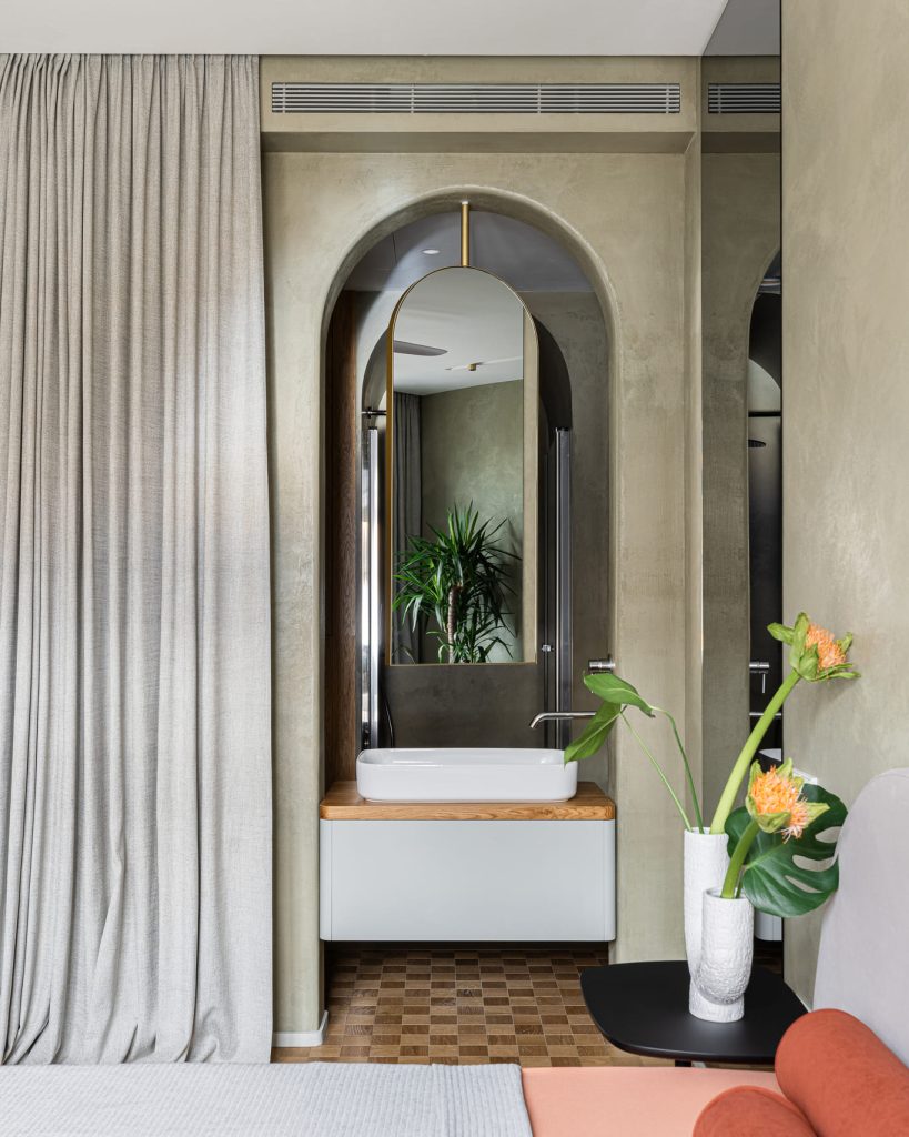 Если общественная зона насыщена солнцем, то приватная часть словно уходит в тень. Для стен дизайнер выбрала серый микроцемент, который неожиданно ушёл в тёплый хаки и создал идеально спокойную, камерную атмосферу. Вся обстановка написана крупными мазками: лаконичная мебель, геометричные формы, портьеры с фактурой рогожки… Особую роль отвели комоду с грифонами: застройщика вдохновил особняк Тихона Булычёва авторства архитектора Чарушина, и Анна Исупова отдала дань уважения знаковой детали неоготического здания.